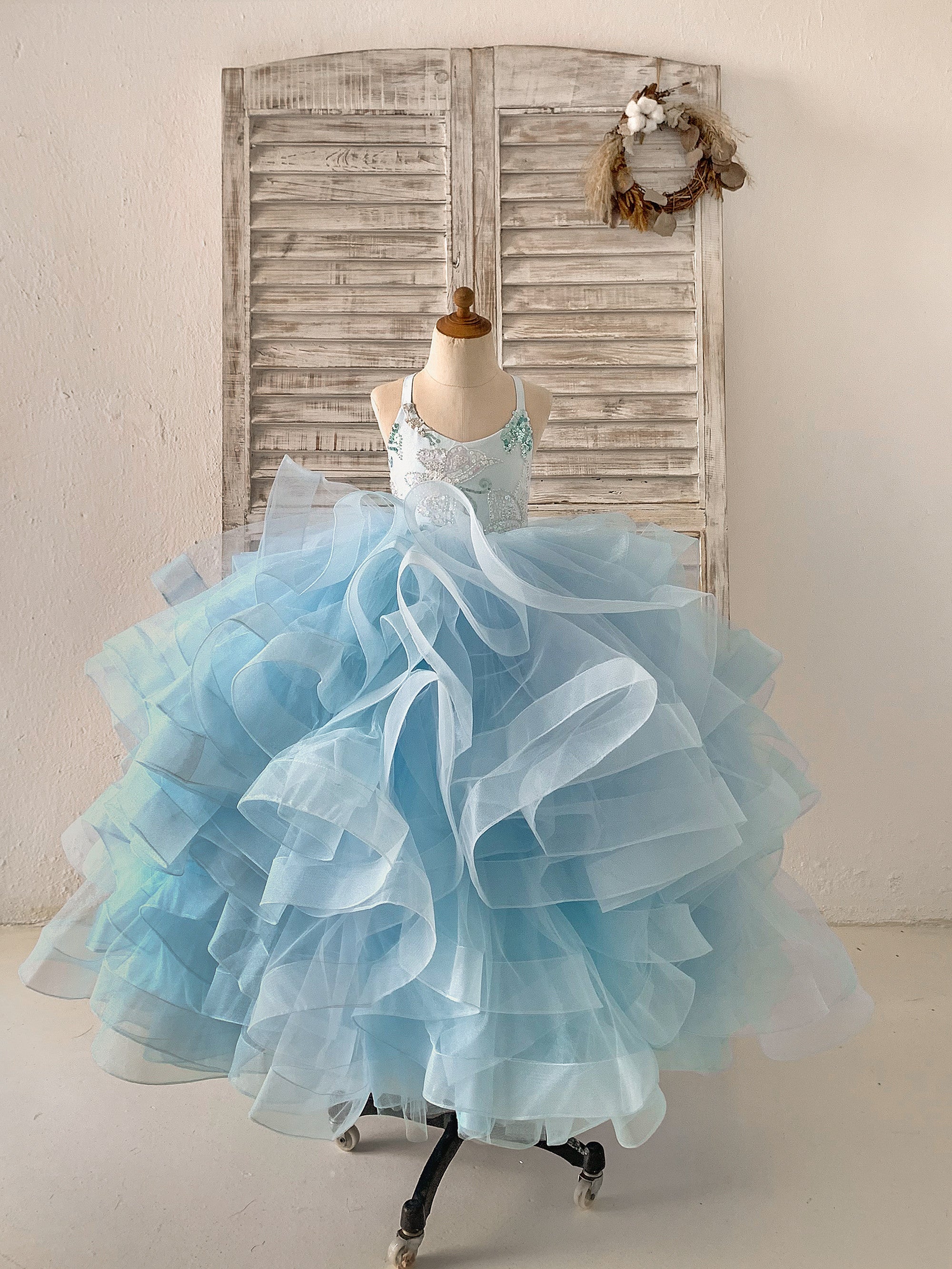 Beaded Butterfly Light Blue Straps Ruffle Tulle Horsehair Wedding Flower Girl Dress