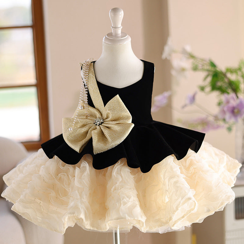 This gorgeous girls’ dress combines luxurious soft black velvet with beautiful champagne tulle fabric. Featuring a chic V-neckline and sleeveless style, the paneled bodice extends down over the rose-patterned, fluffy tulle skirt. A pre-attached champagne gold bow, adorned with pearls and sparkling rhinestone, adds a dramatic touch. The covered buttons is gold and elegant down the back along the invisible zipper closure for an adorable compliment. Blending vintage with modern style, this little girl’s dress is perfect for special occassions like parties, pageants, or weddings.