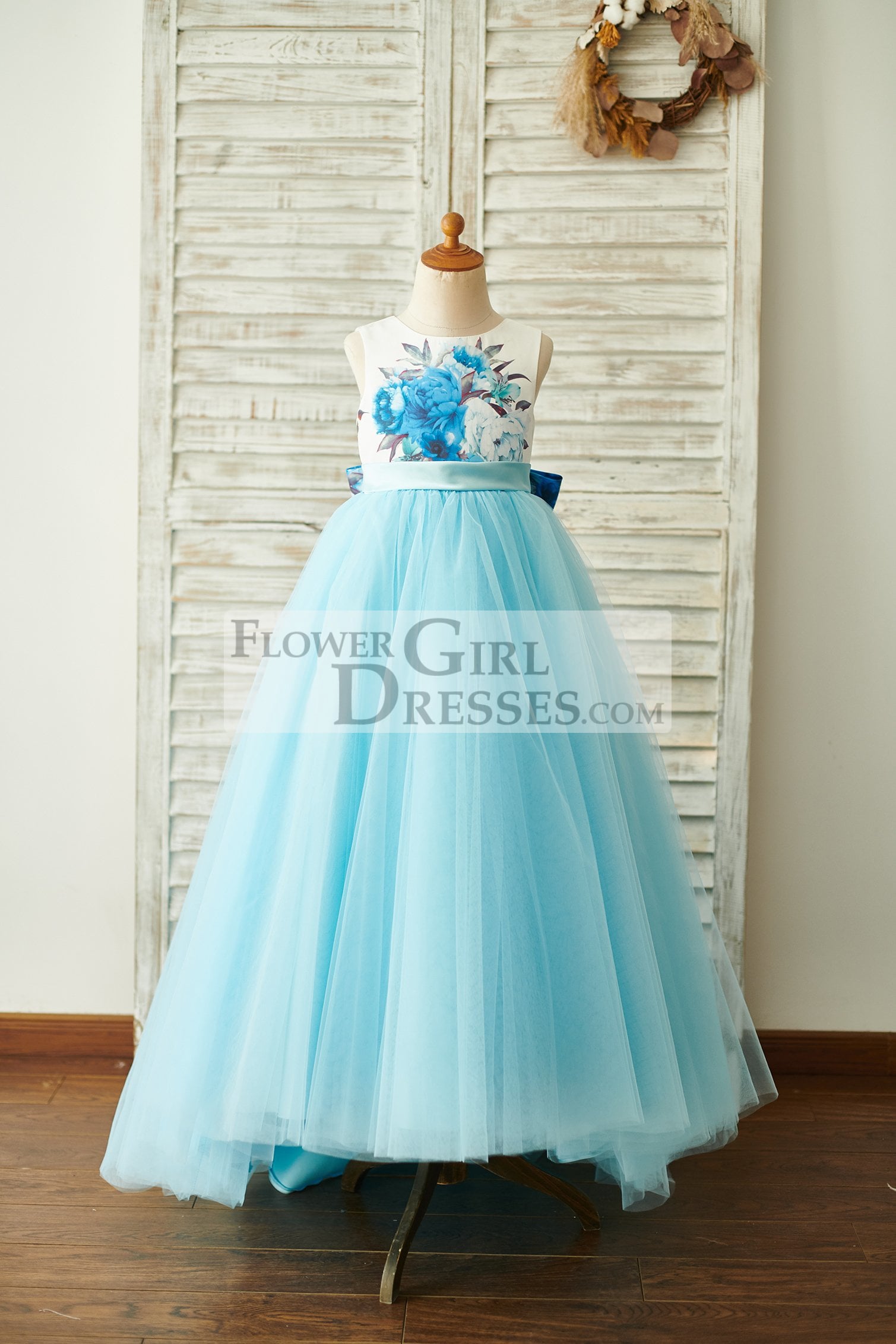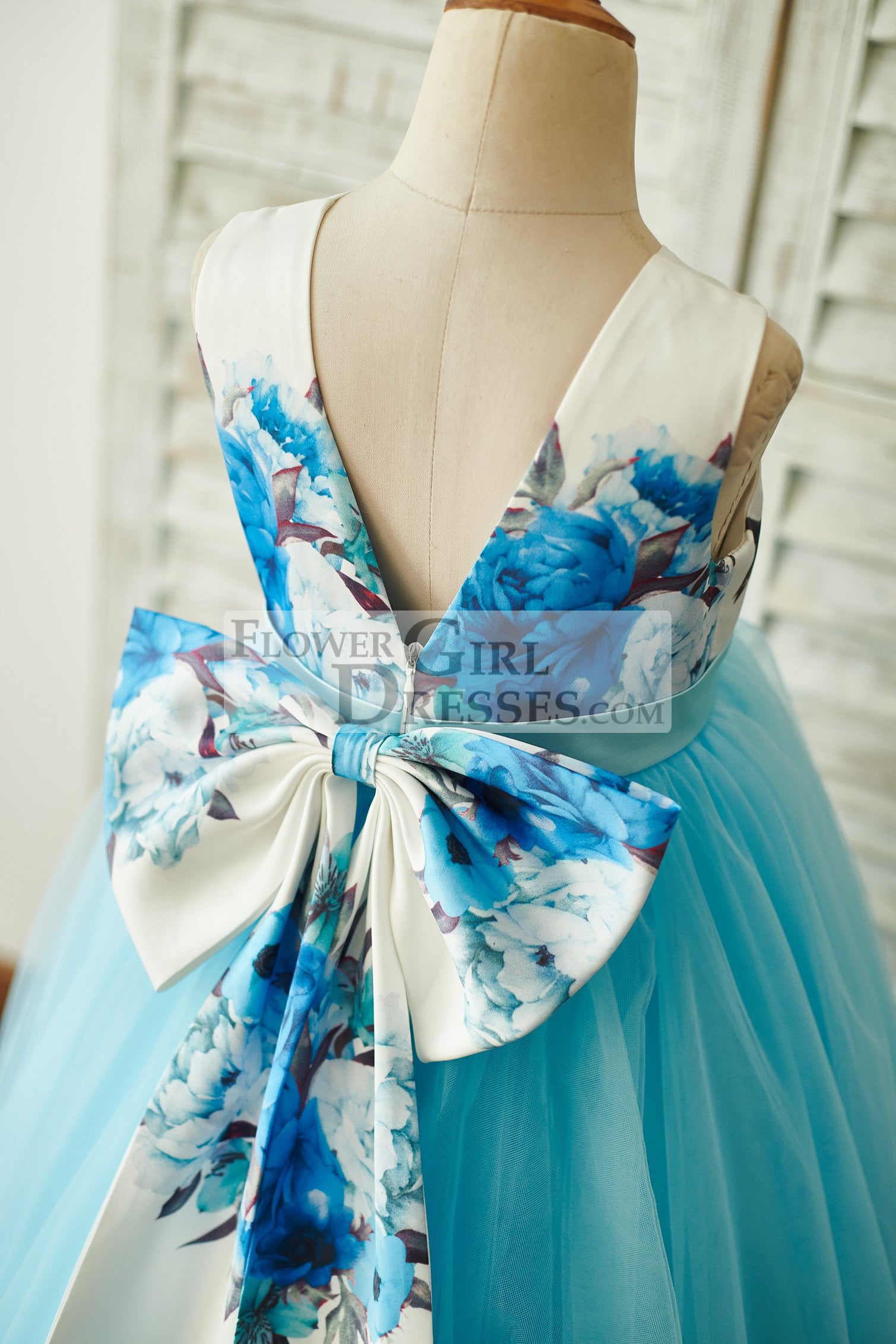 Blue Printed Floral Satin Tulle V Back Wedding Flower Girl Dress, Bow