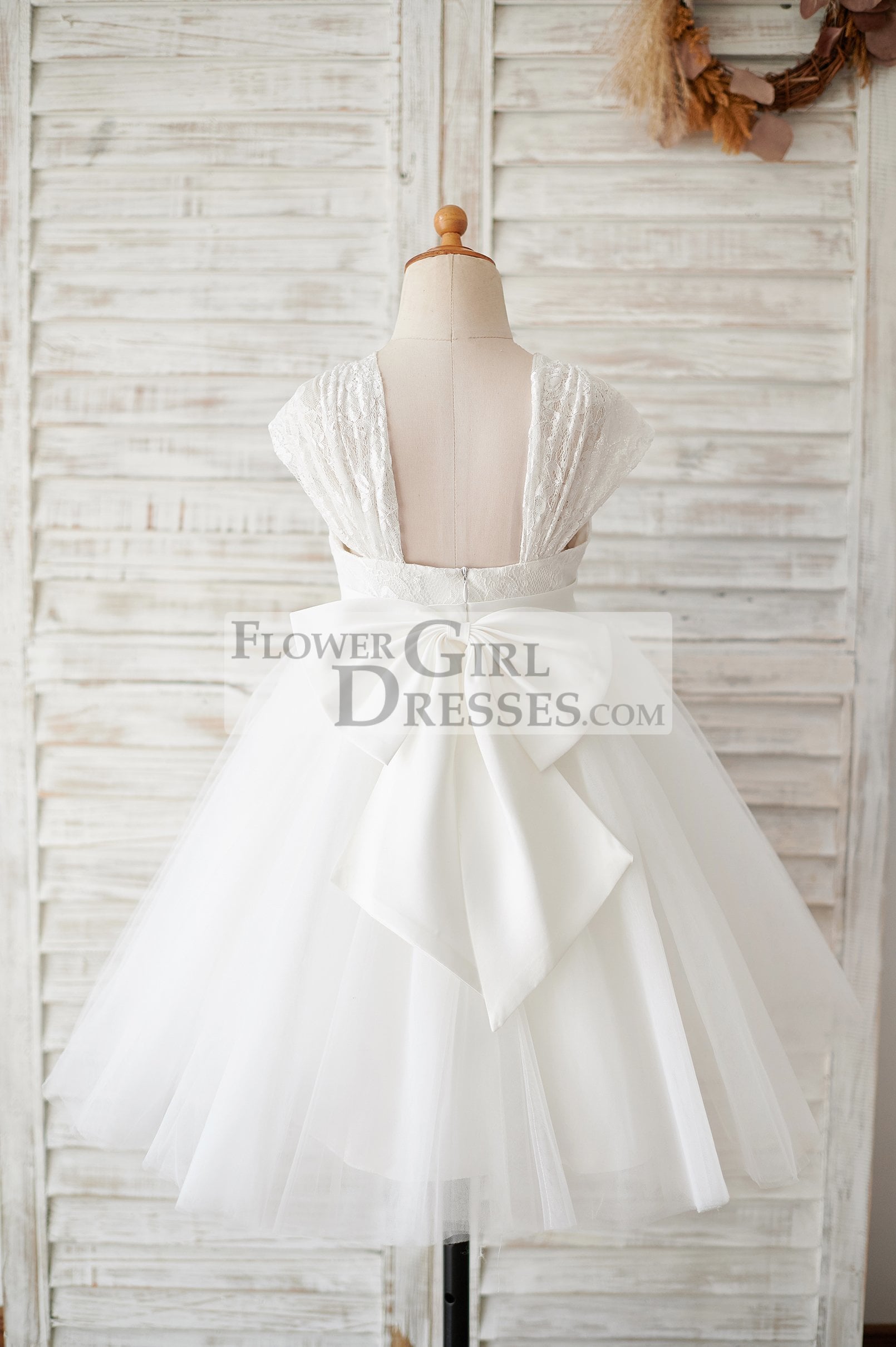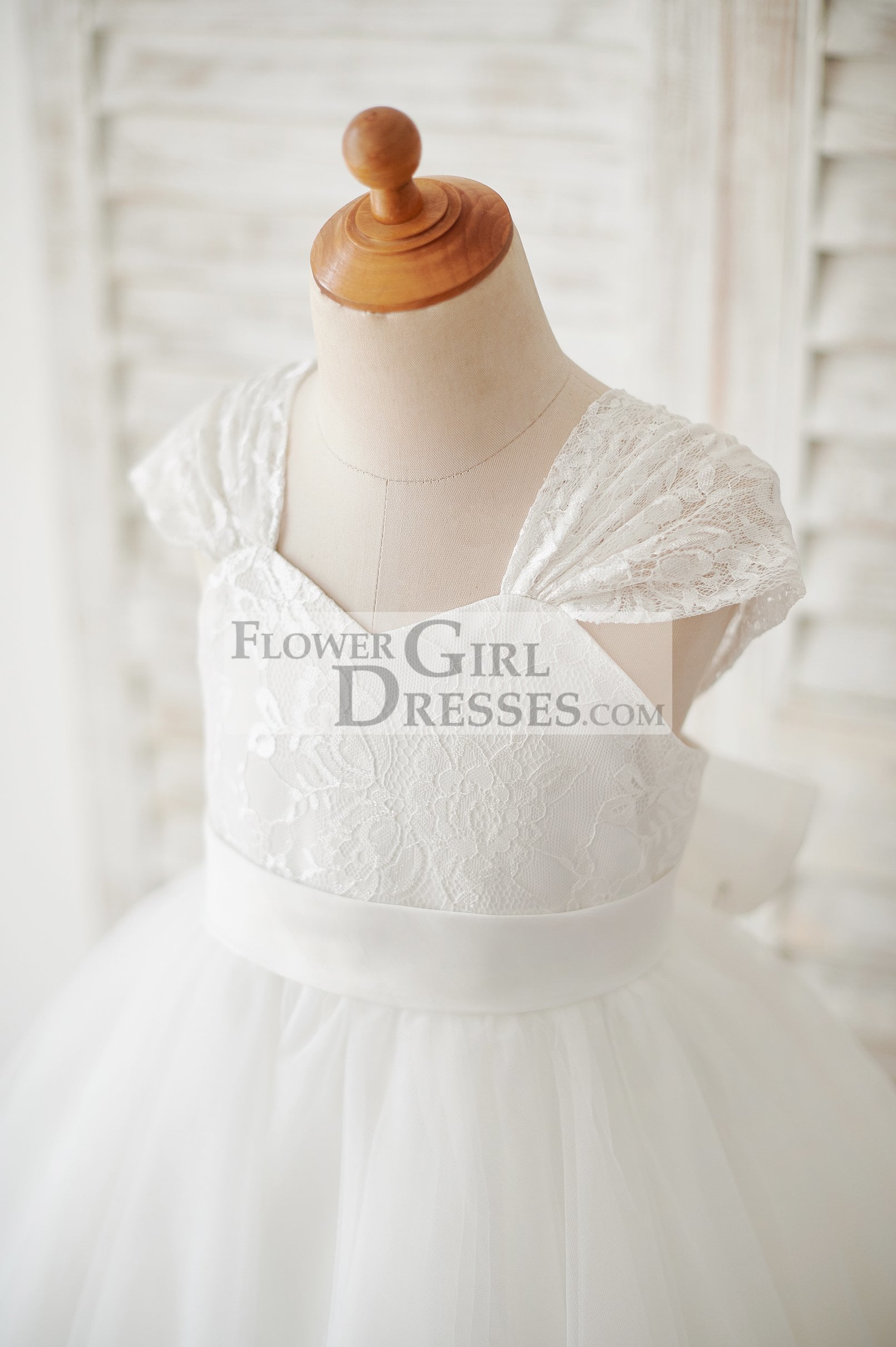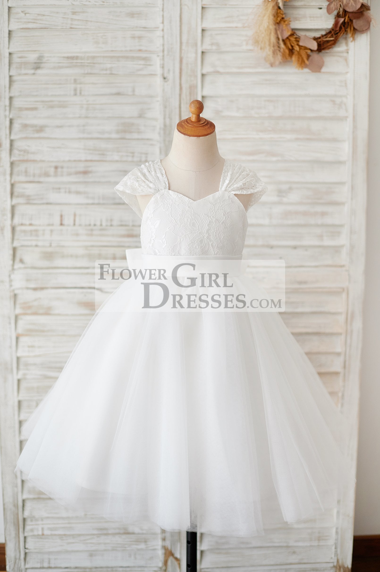 Cap Sleeves Ivory Lace Tulle Wedding Flower Girl Dress, Big Bow