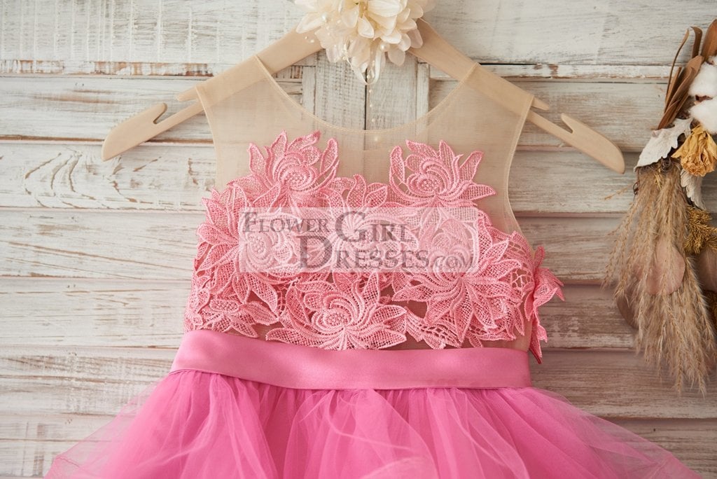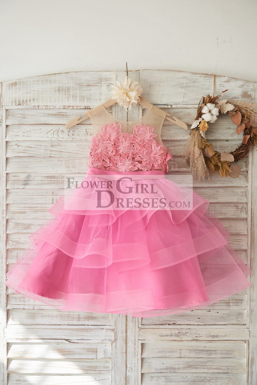 Cupcake Fuchsia Lace Tulle Sheer Neck Horsehair Wedding Flower Girl Dress