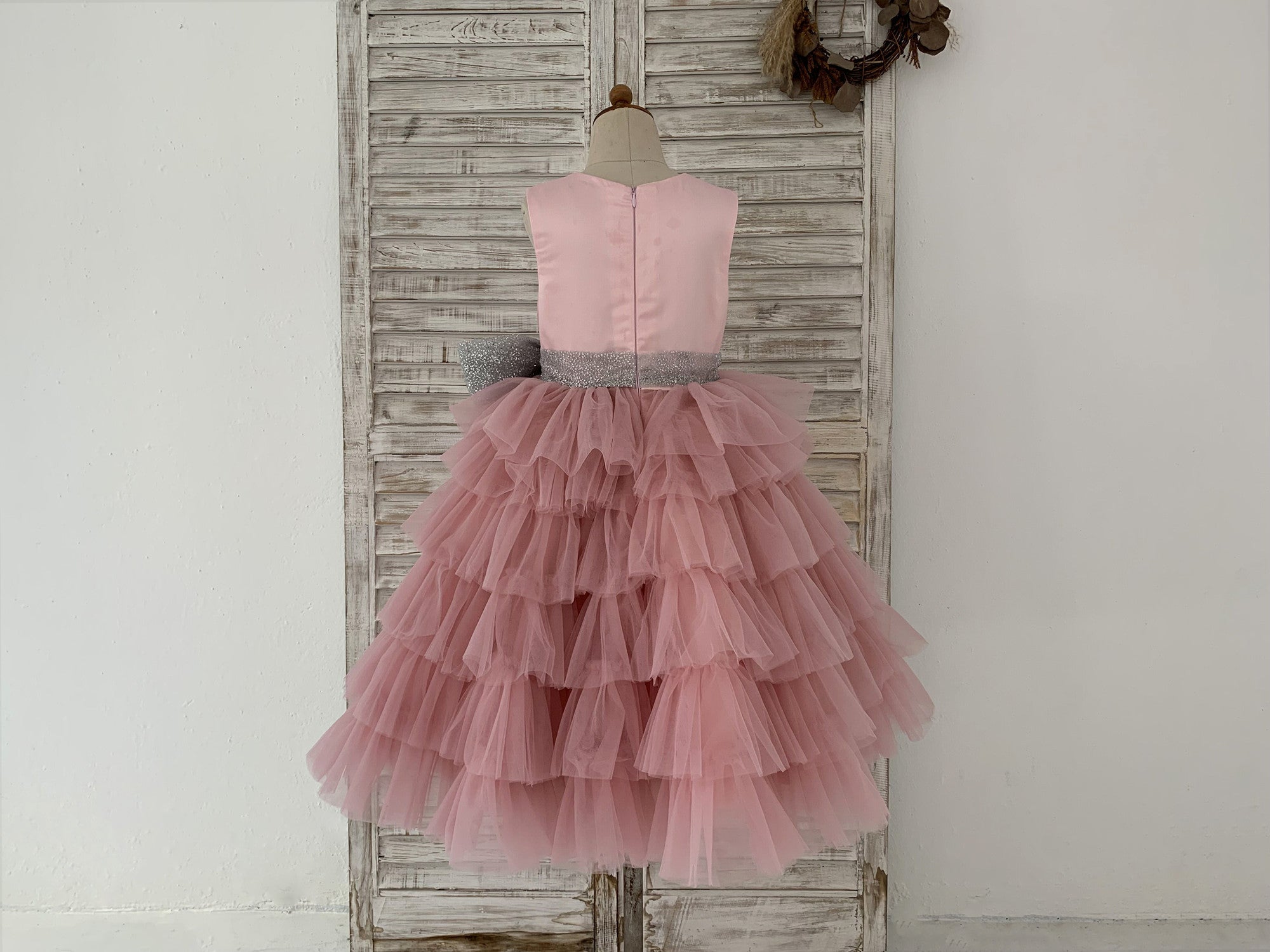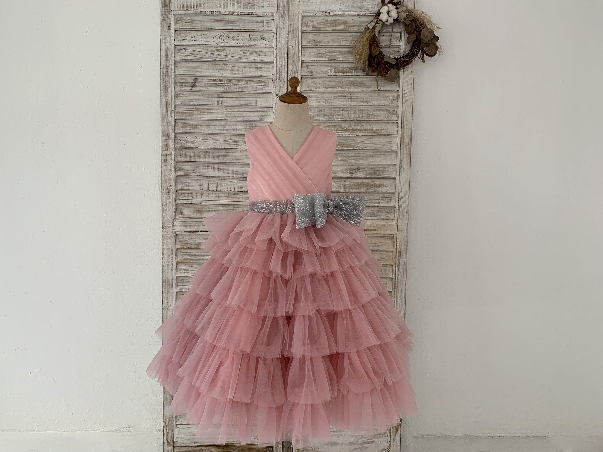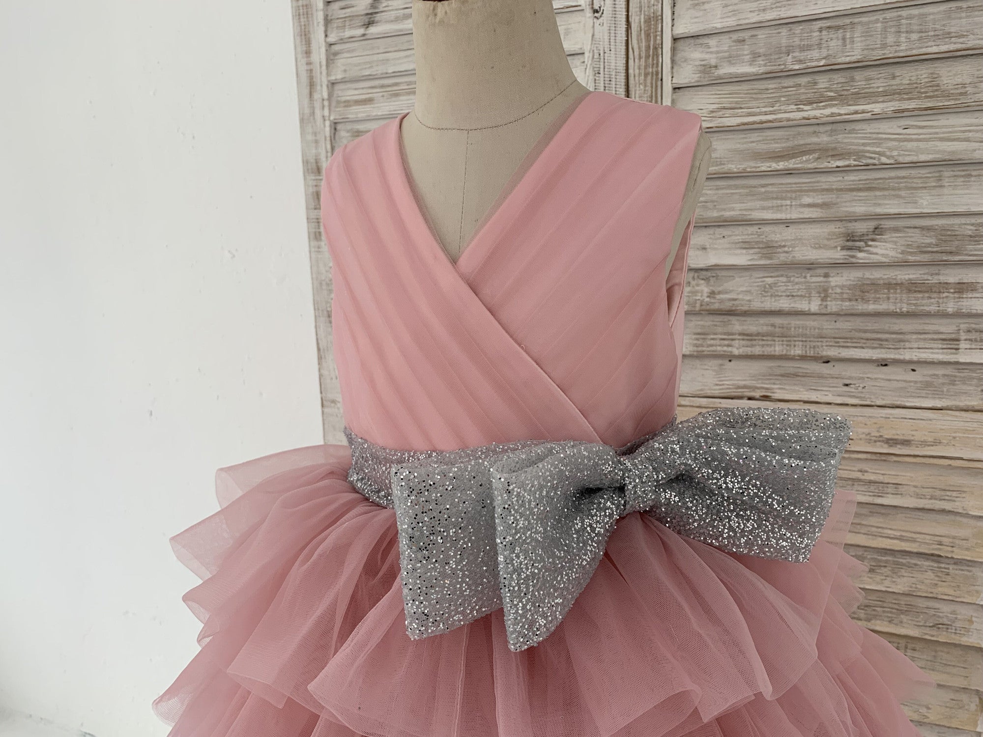 Cupcake Mauve Tulle V Neck Wedding Flower Girl Dress, Glittering Belt Bow