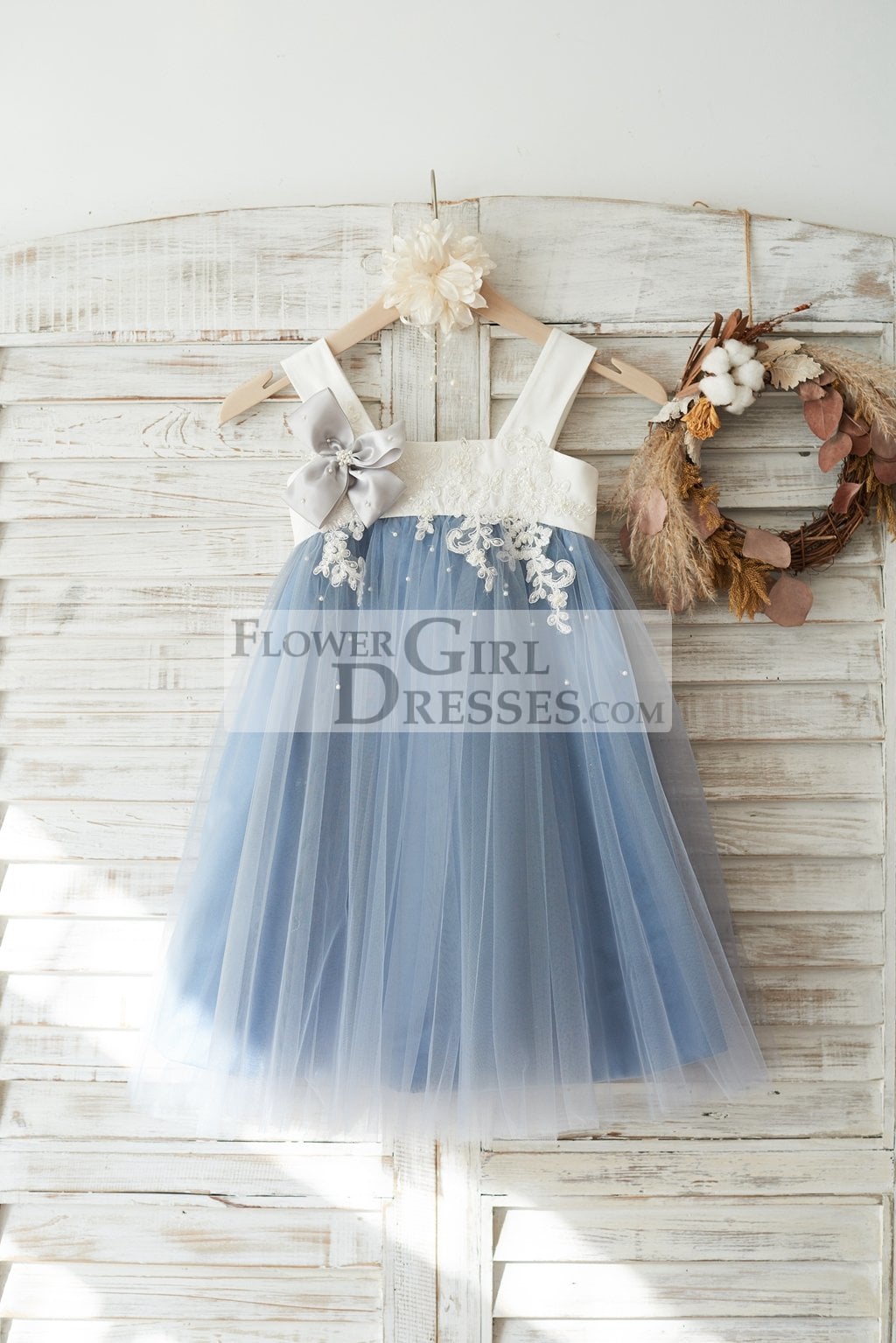 Princess Dusty Blue Tulle Beaded Lace Straps Wedding Flower Girl Dress