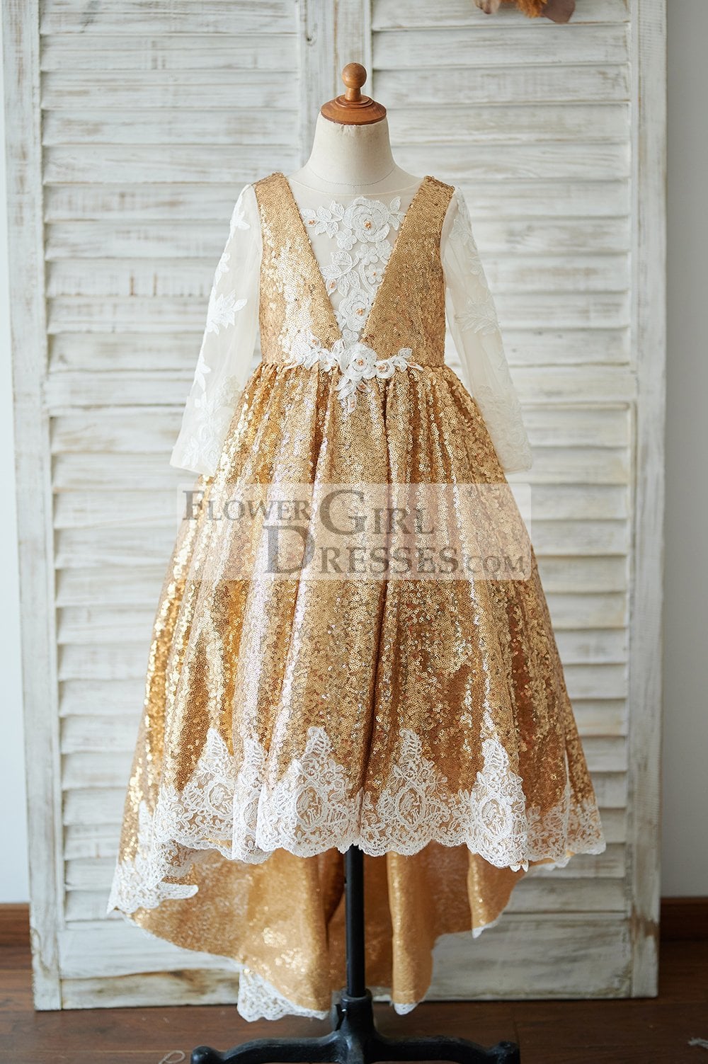 Hi Low Gold Sequin Ivory Lace Tulle V Neck Wedding Flower Girl Dress
