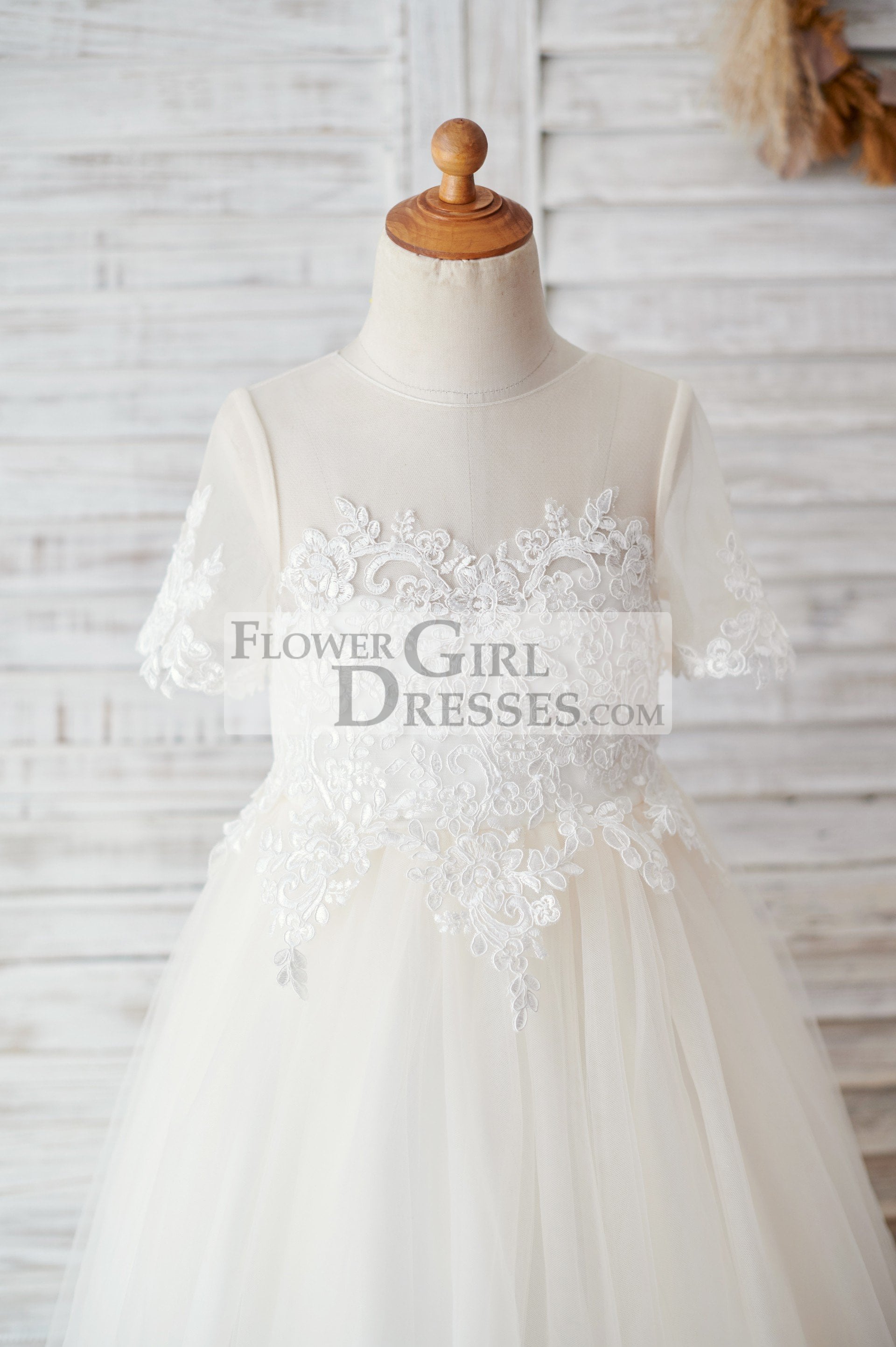 - Sheer illusion tulle neckline with short sleeves;