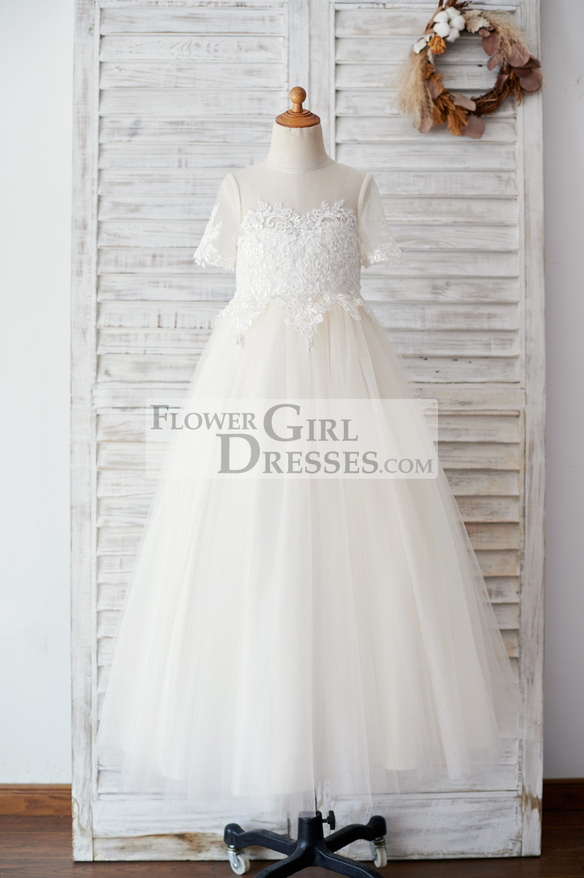 Ivory Lace Champagne Tulle Short Sleeves Wedding Flower Girl Dress