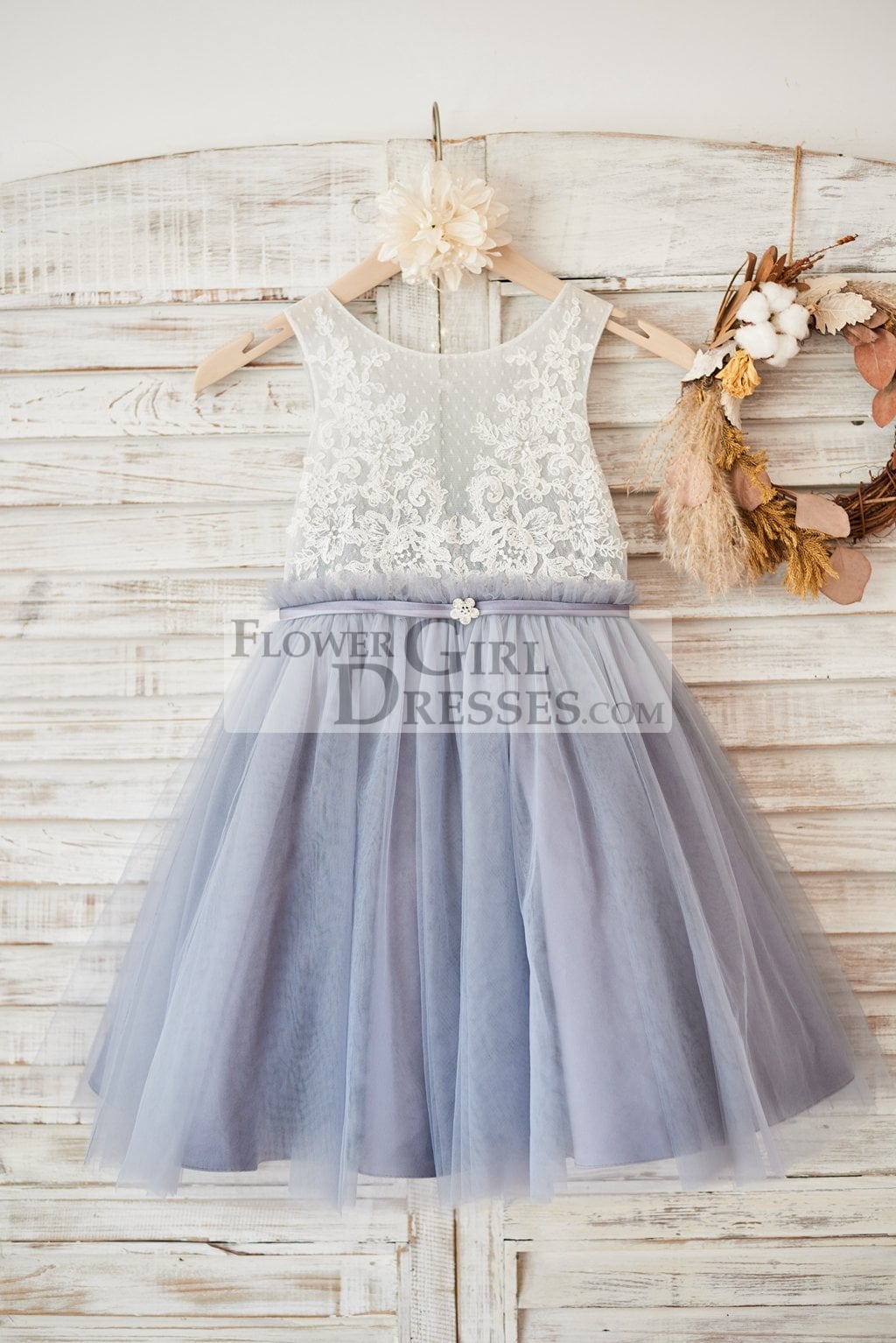 Ivory Lace Gray Tulle Sheer Back Wedding Flower Girl Dress, Belt