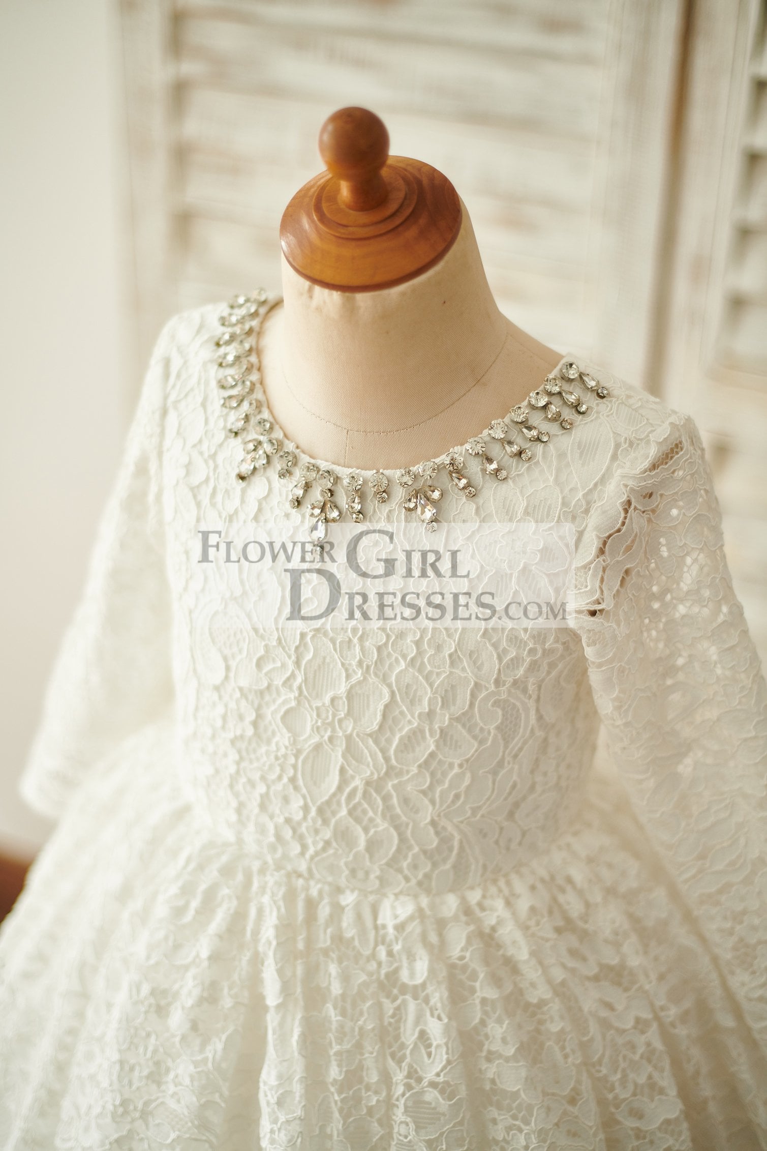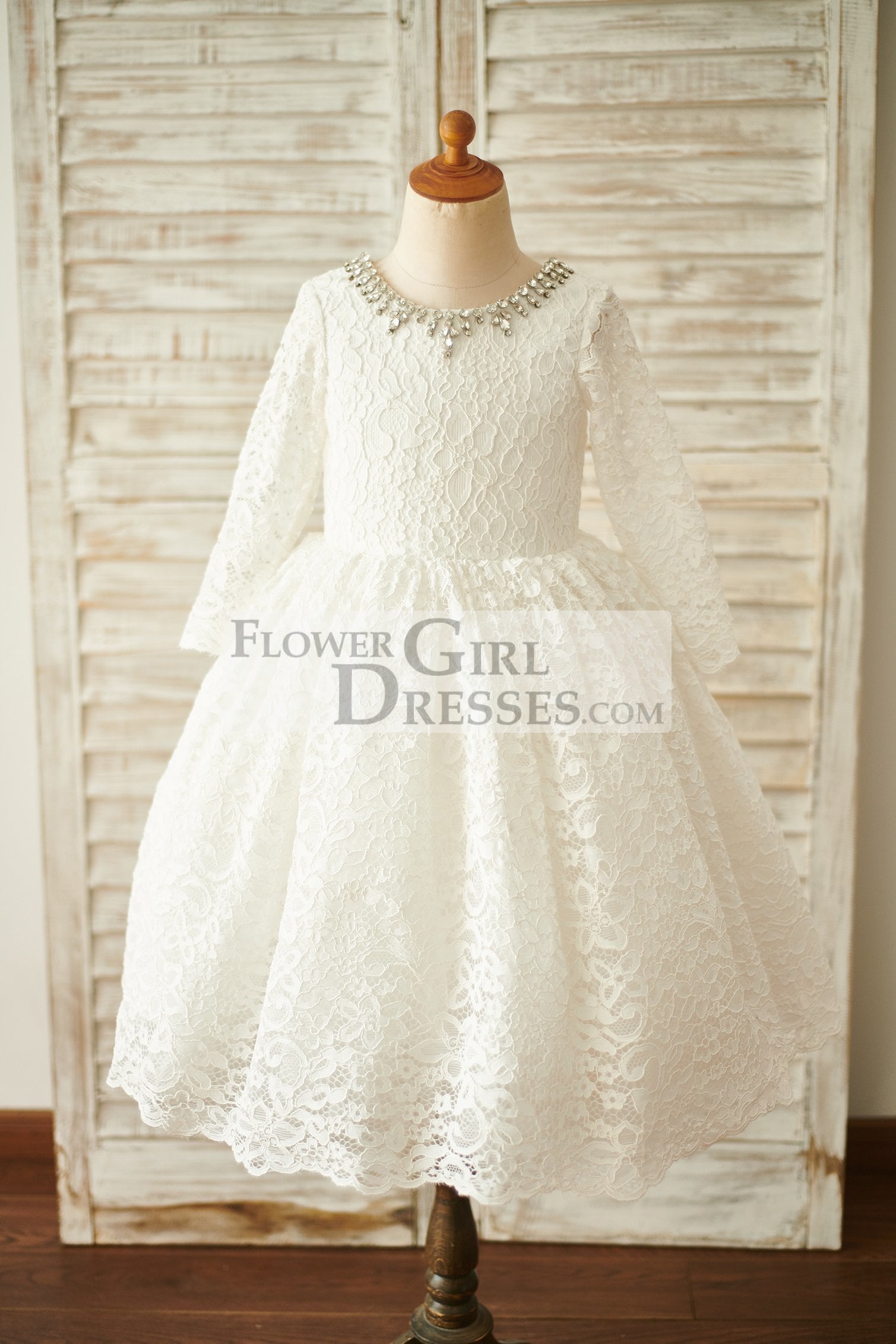 Ivory Lace Long Sleeves Wedding Flower Girl Dress, Beading Neck