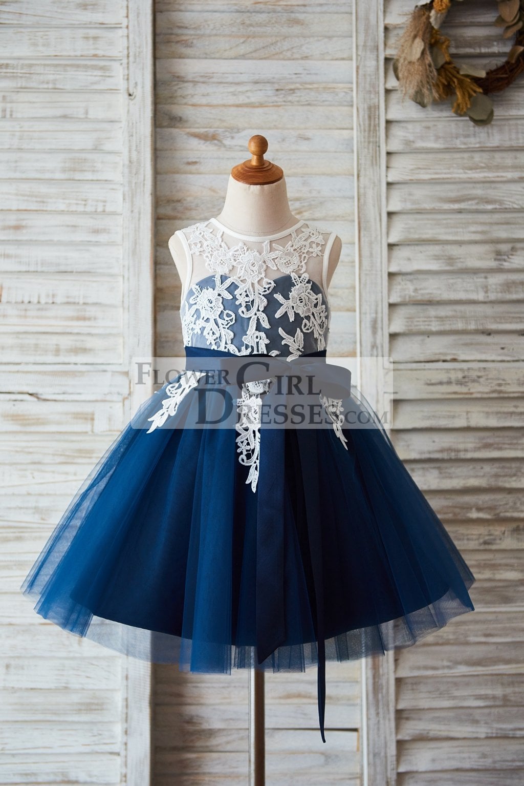 Princess Ivory Lace Navy Blue Tulle V Back Wedding Flower Girl Dress