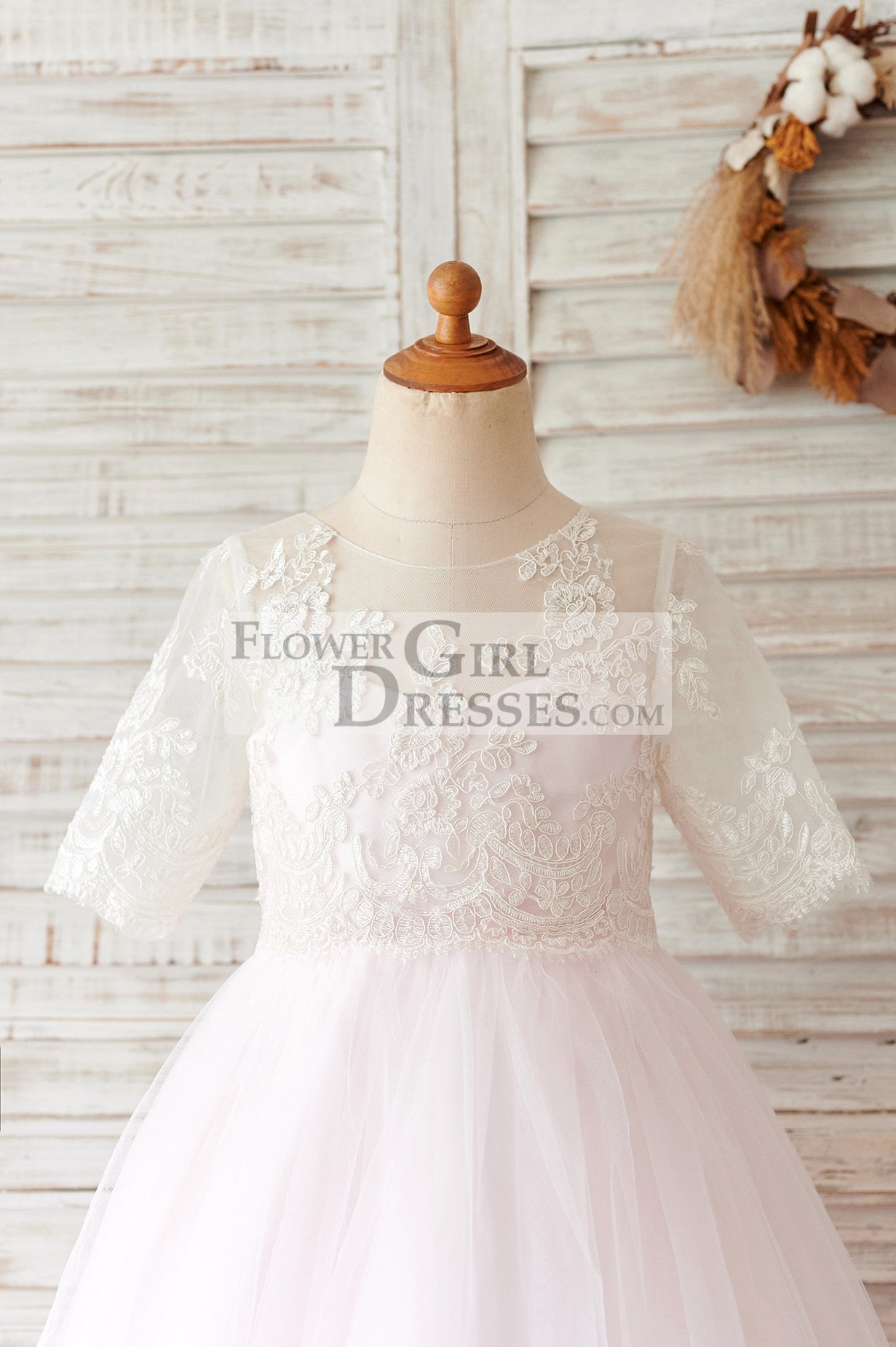 Princess Ivory Lace Pink Tulle Short Sleeves Wedding Flower Girl Dress