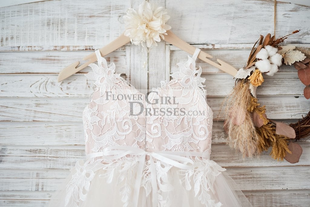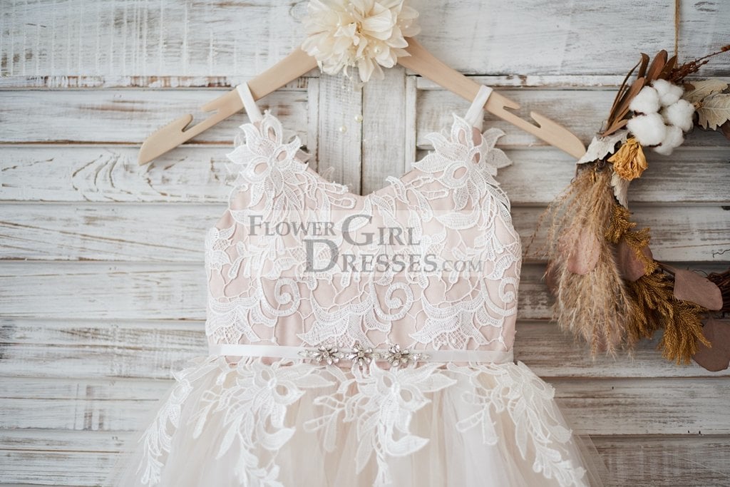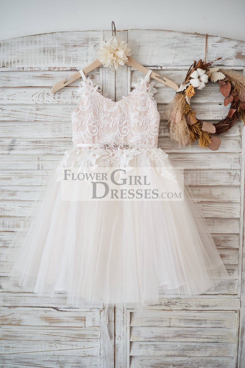 Ivory Lace Tulle Peach Spaghetti Straps Wedding Flower Girl Dress, Belt