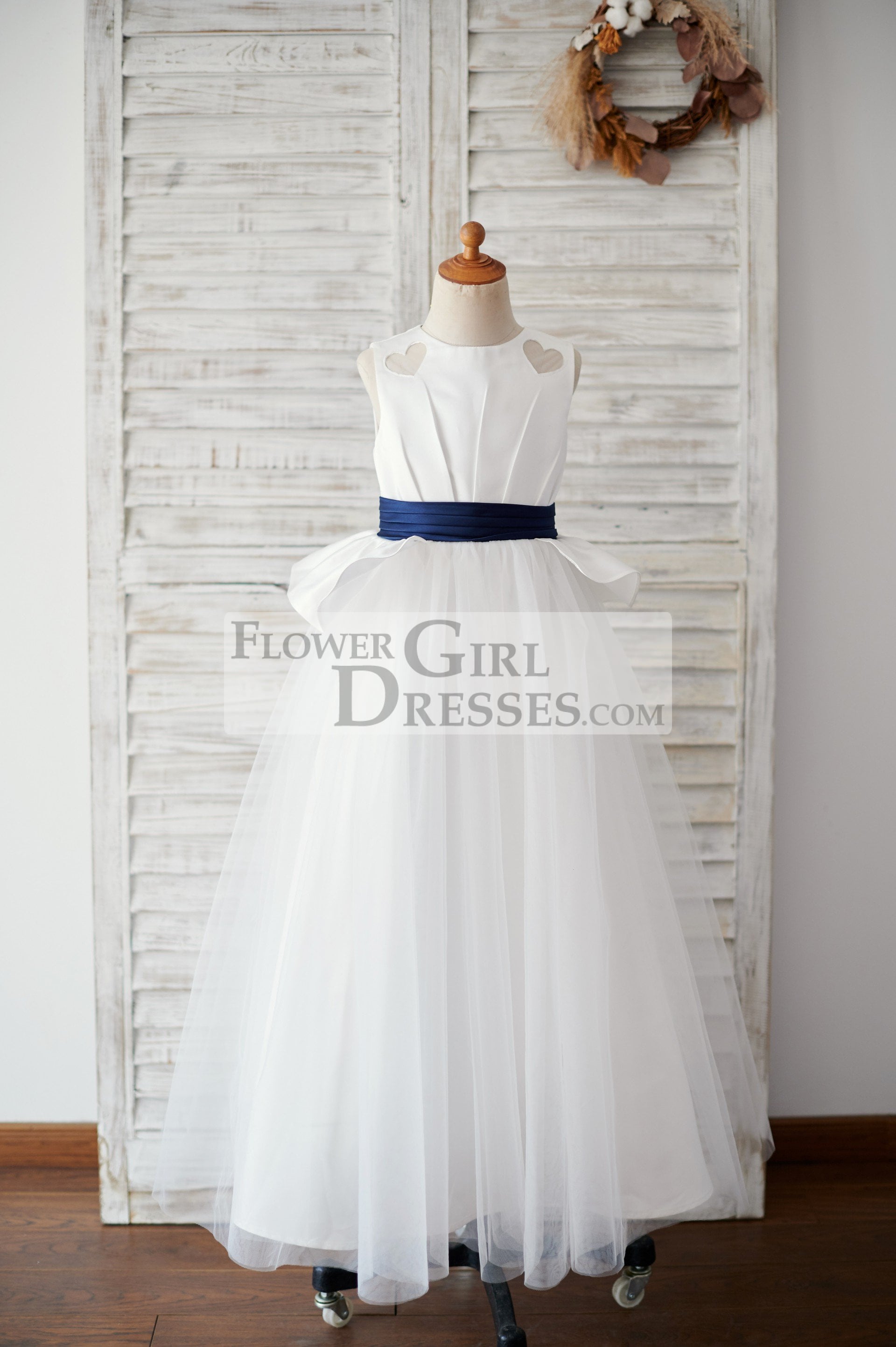 Princess Ivory Satin Tulle Wedding Flower Girl Dress, Navy Blue Belt