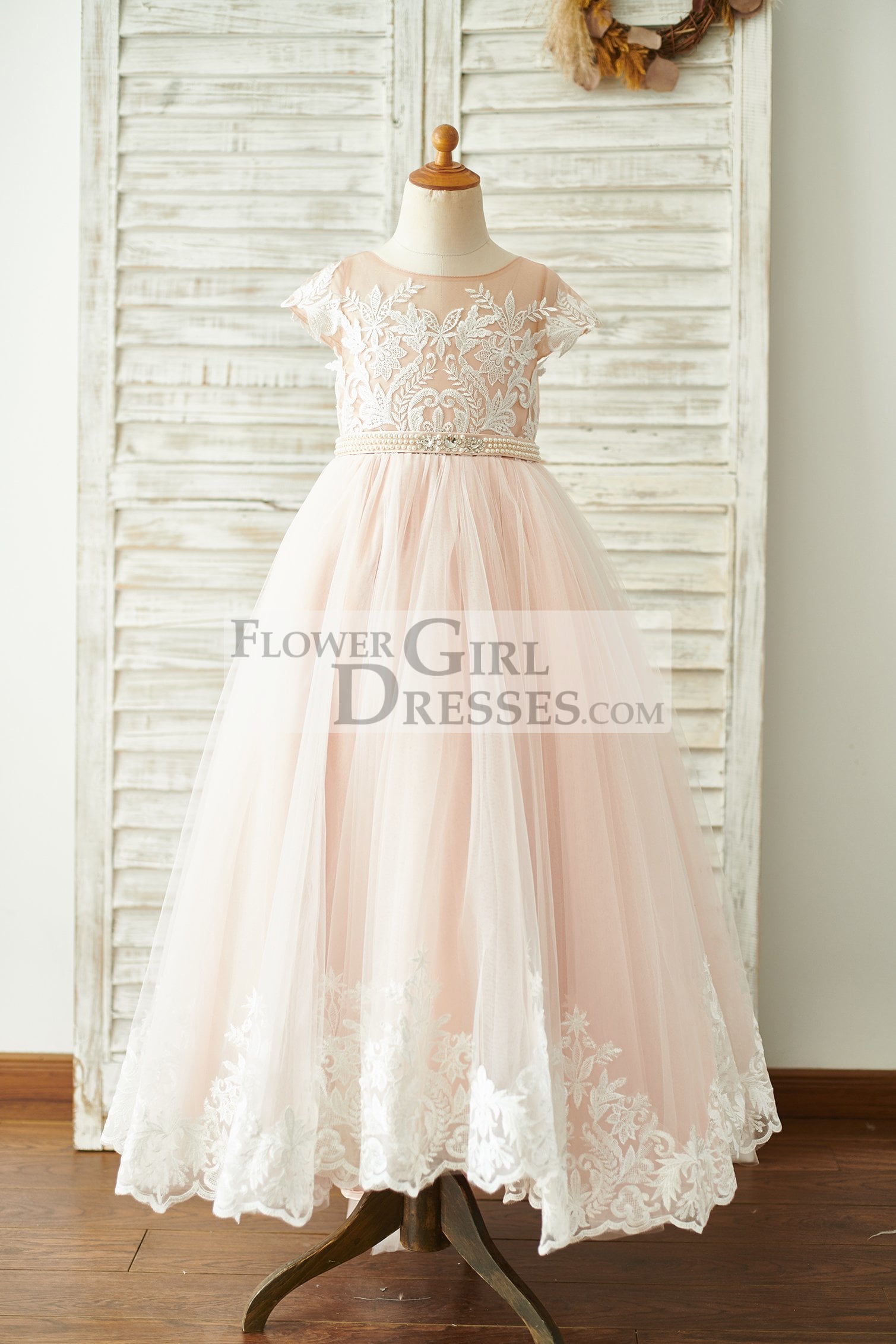 Pink Lace Tulle V Back Cap Sleeves Floor Length Wedding Flower Girl Dress