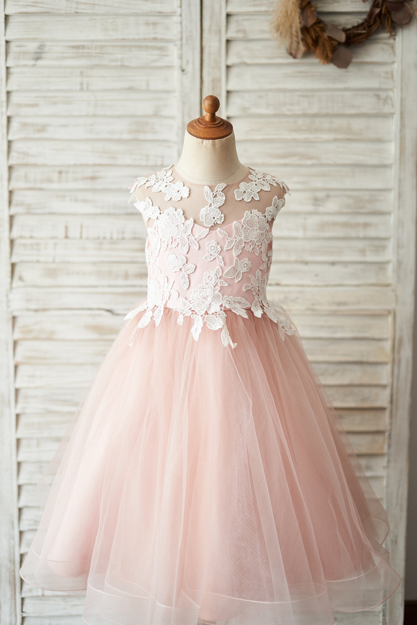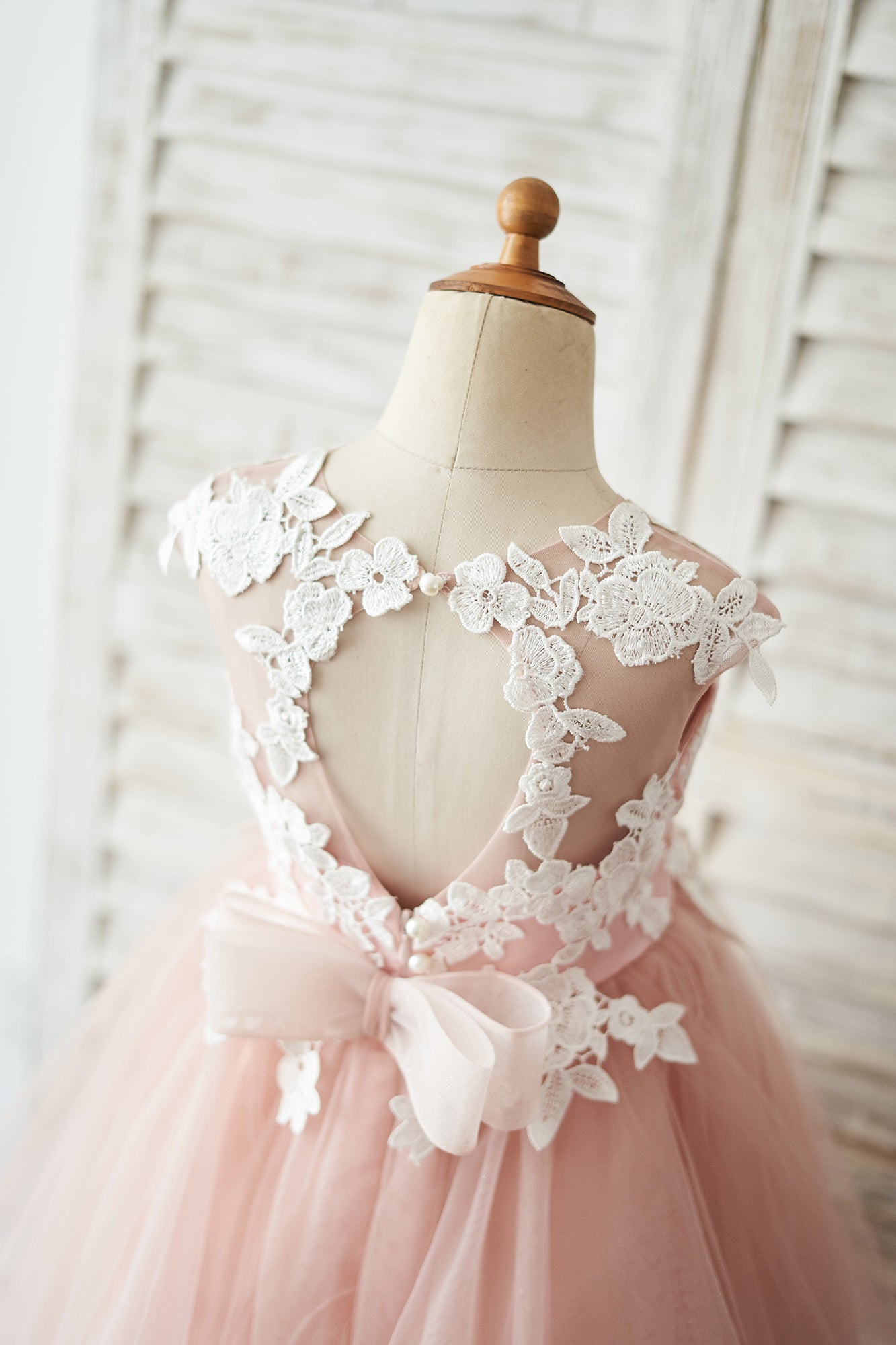 Mauve Tulle Ivory Lace Keyhole Back Wedding Flower Girl Dress Kids Formal Dress