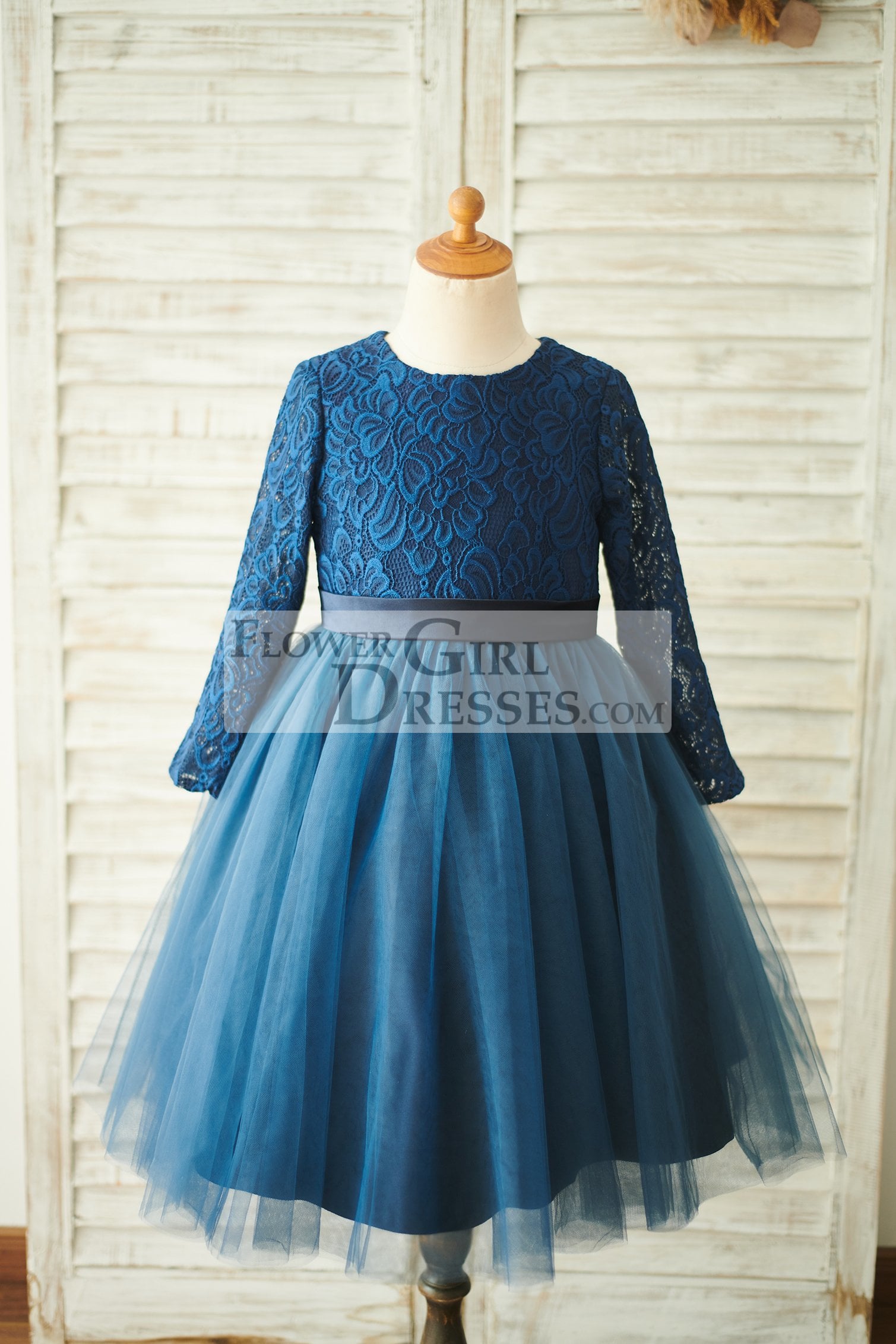Navy Blue Lace Tulle Long Sleeves Wedding Flower Girl Dress
