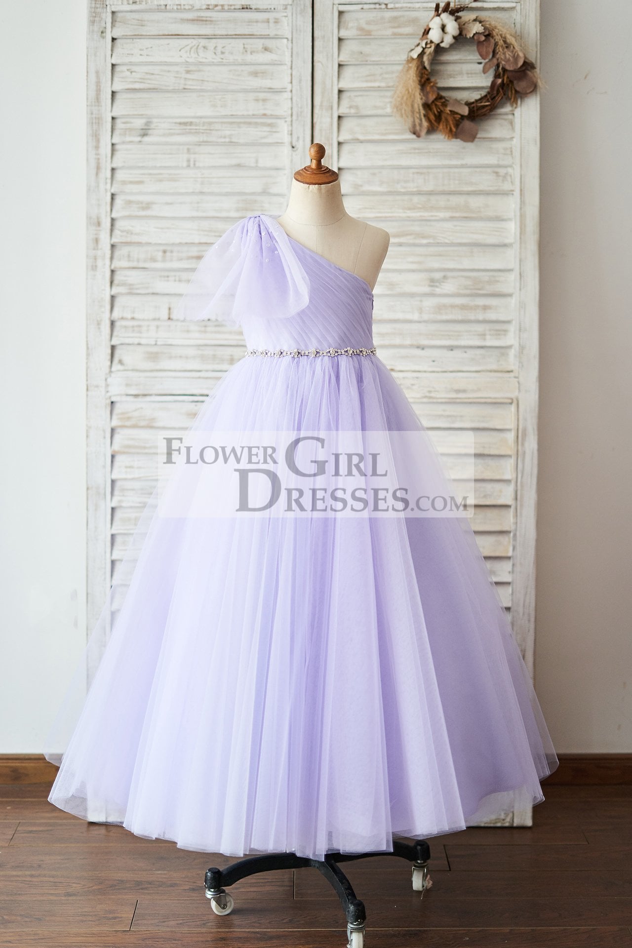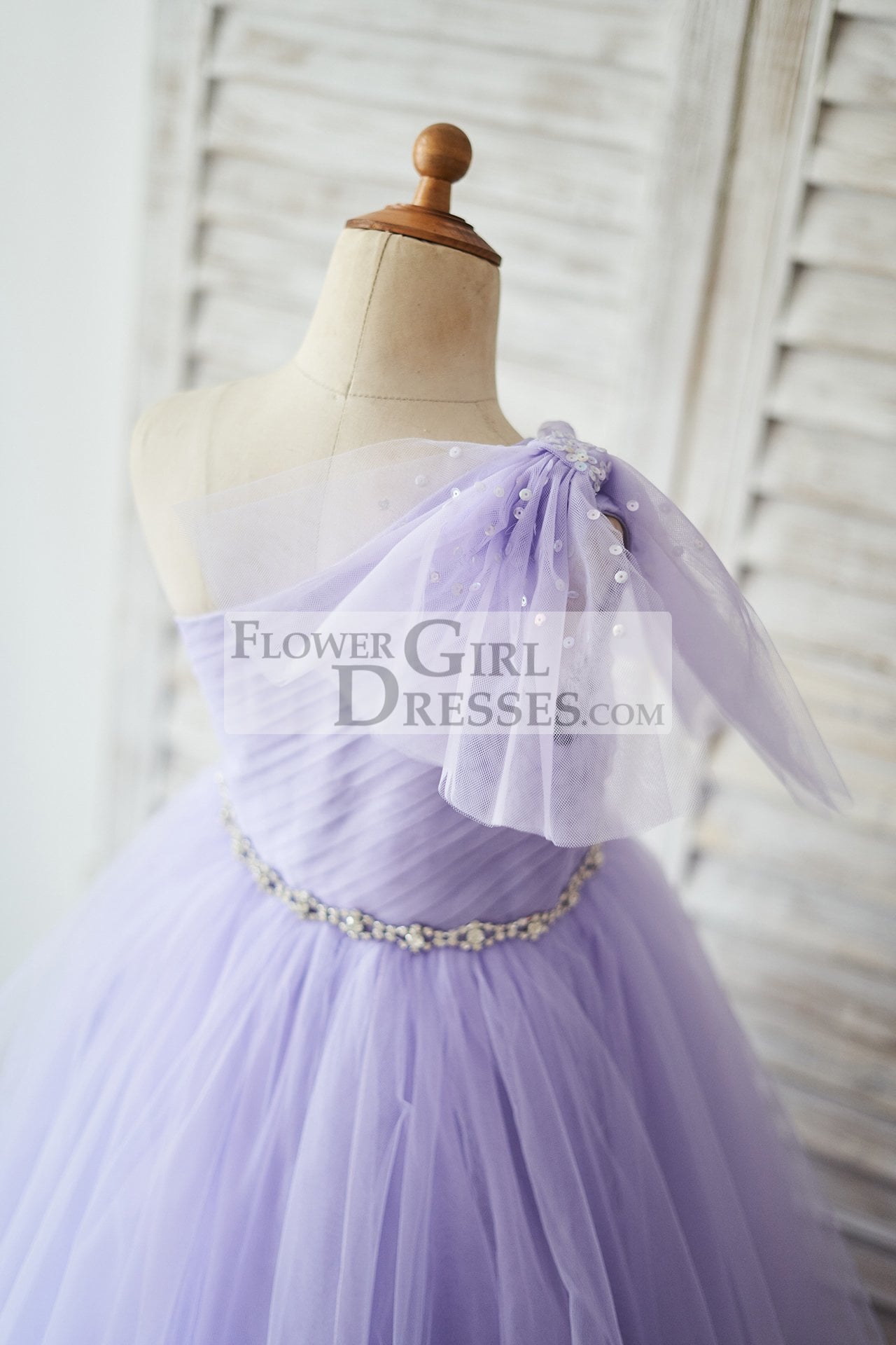 Ball Gown One Shoulder Beaded Lavender Tulle Wedding Flower Girl Dress