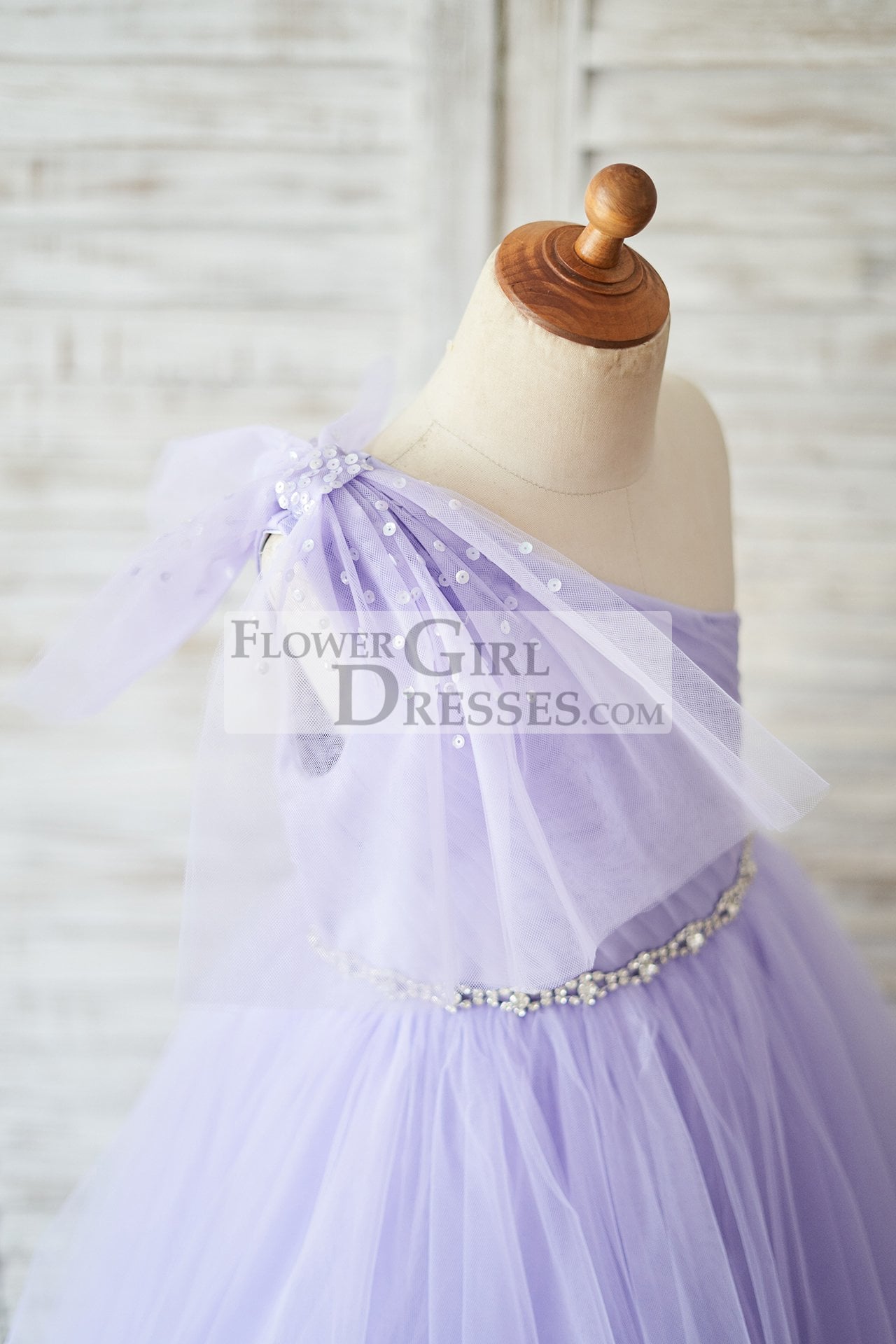 Be a princess in this exquisite one shoulder beaded lavender tulle ball gown wedding flower girl dress! With its high quality luxurious tulle fabric, this dress will make your special day even more memorable and magical. This dress features a big sequined tulle bow on the shoulder for a glamorous and elegant look, and is accented with a crystal beaded belt at the waist for a touch of sparkle. The floor length skirt is full of soft layers of dreamy lavender tulle for a fairytale style you’ll adore.