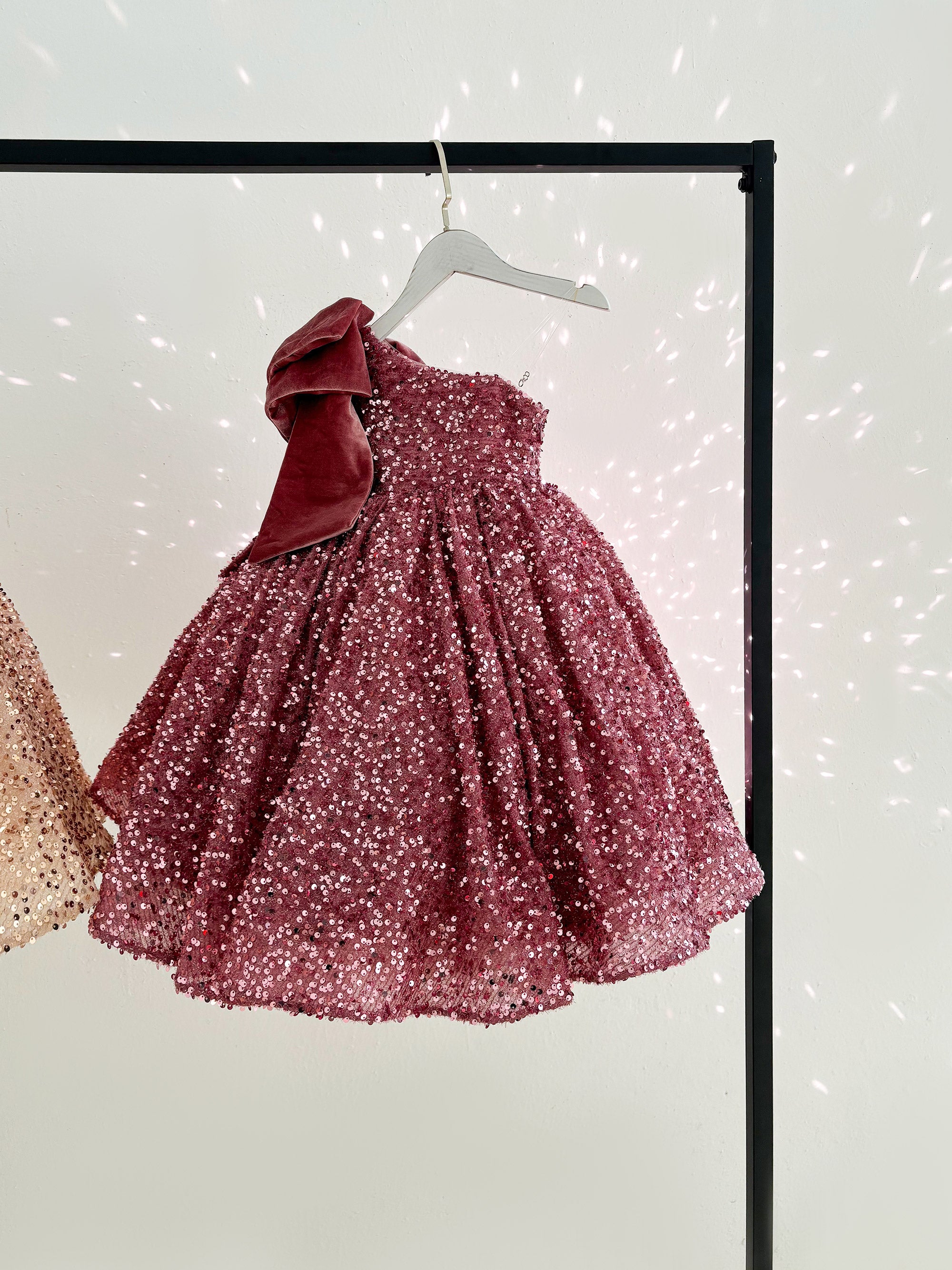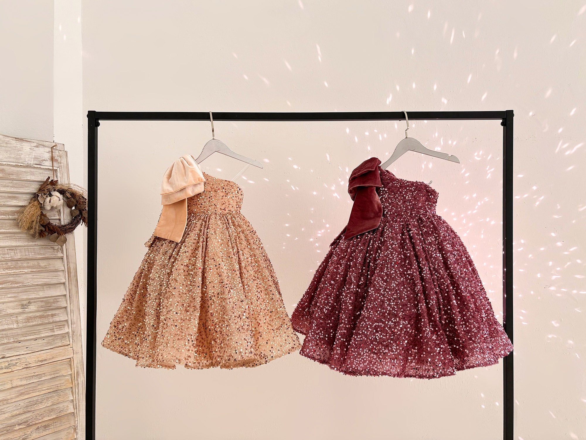 These are formal party girl’s dresses, one is made of rich burgundy sequins and another is radiant golden sequins. Enhanced with a large velvet bow attached to one shoulder that adds an extra touch of sophistication. Dazzling with its sequins, charming single-sleeve design, and voluminous knee-length skirt in ball gown style, this captivating flower girl dress ensures your little ones look adorable and feel special at a wedding or party.