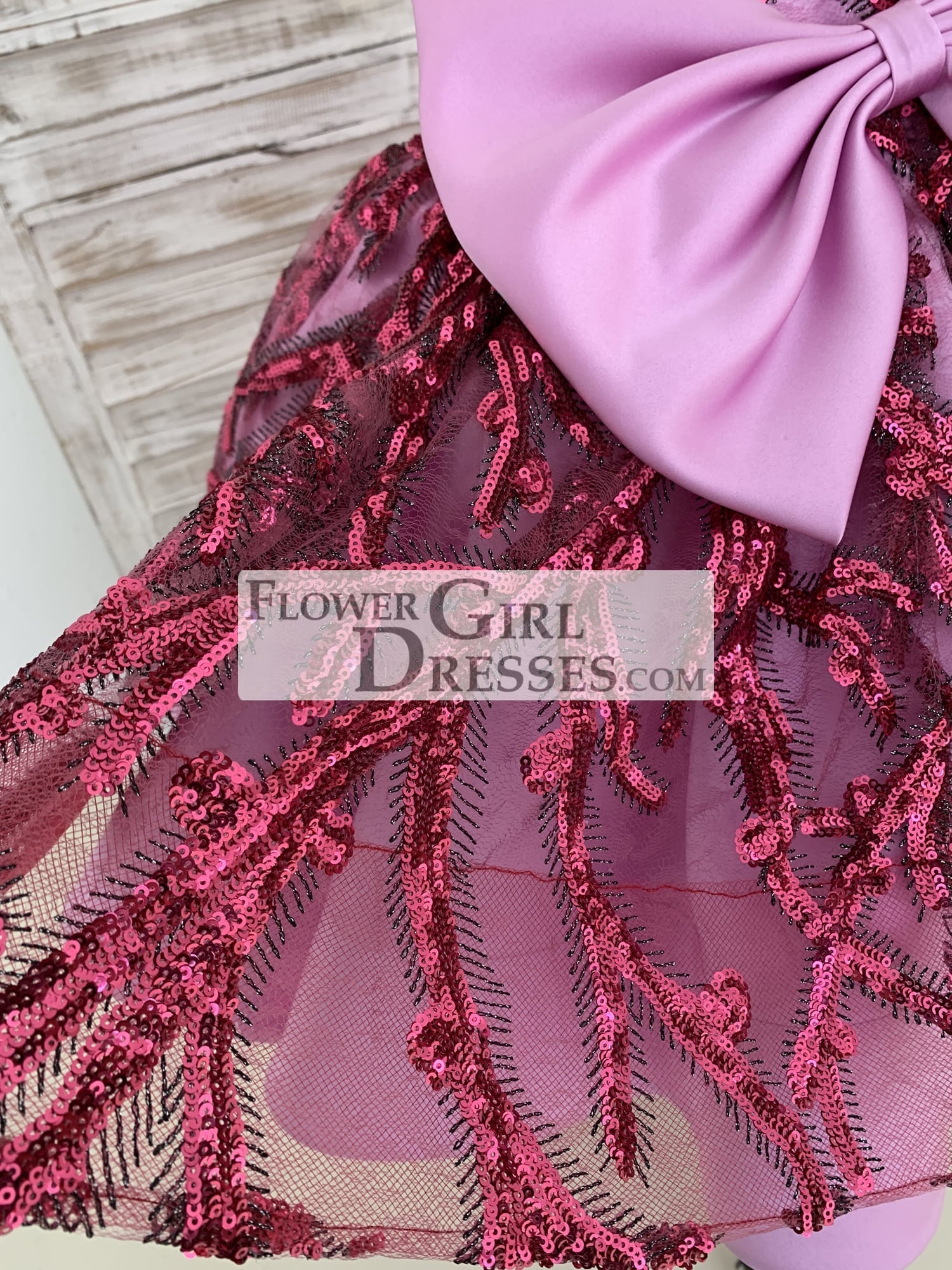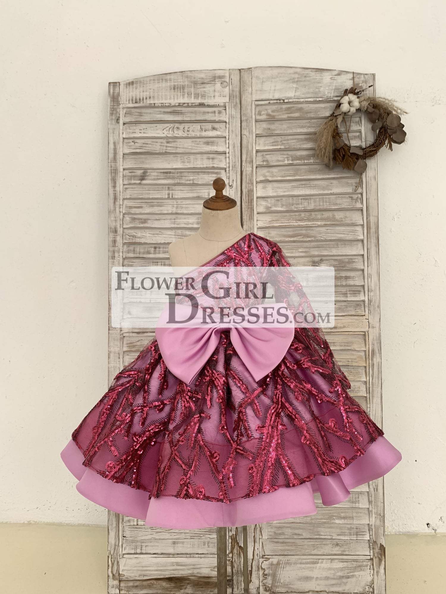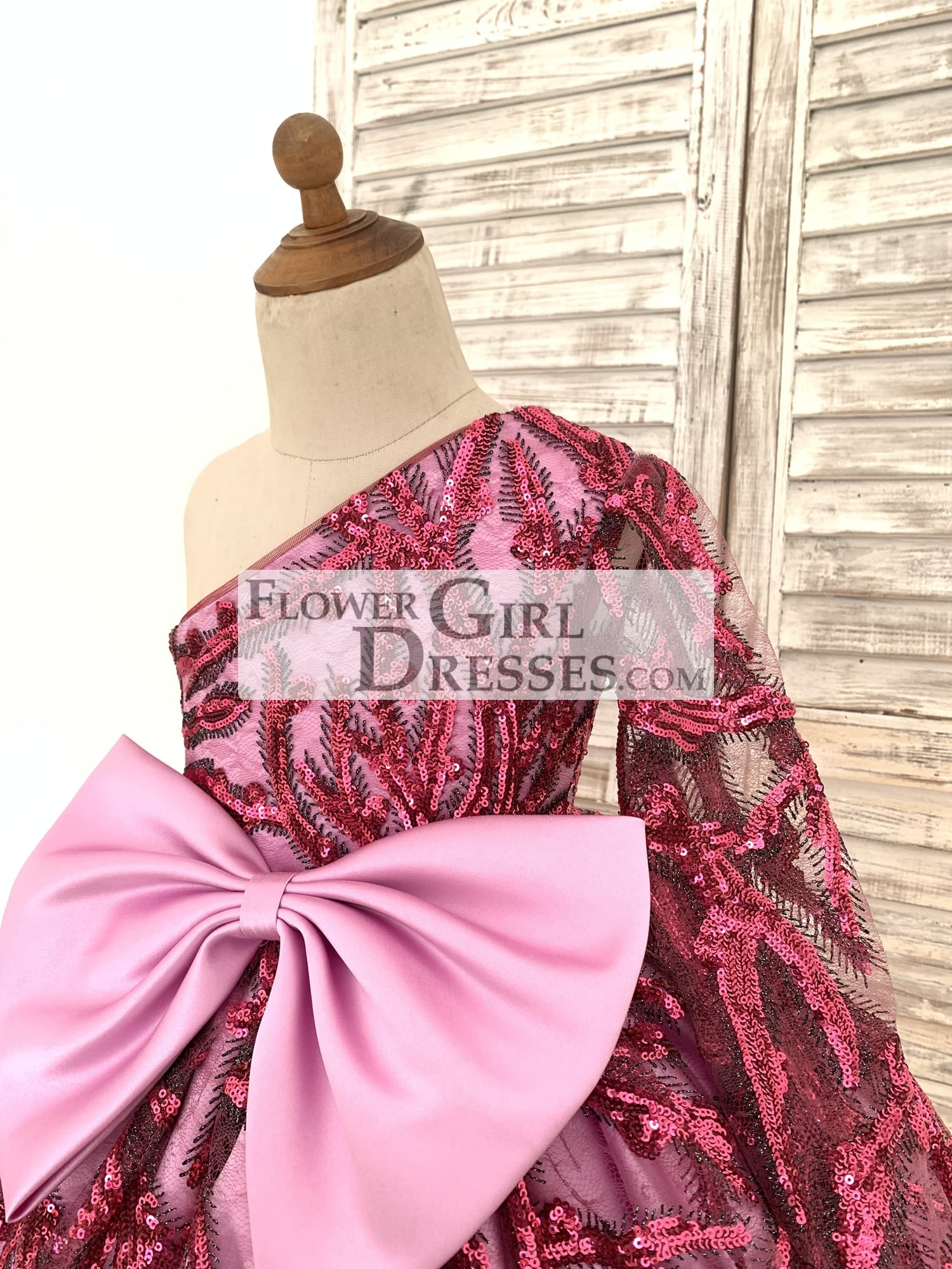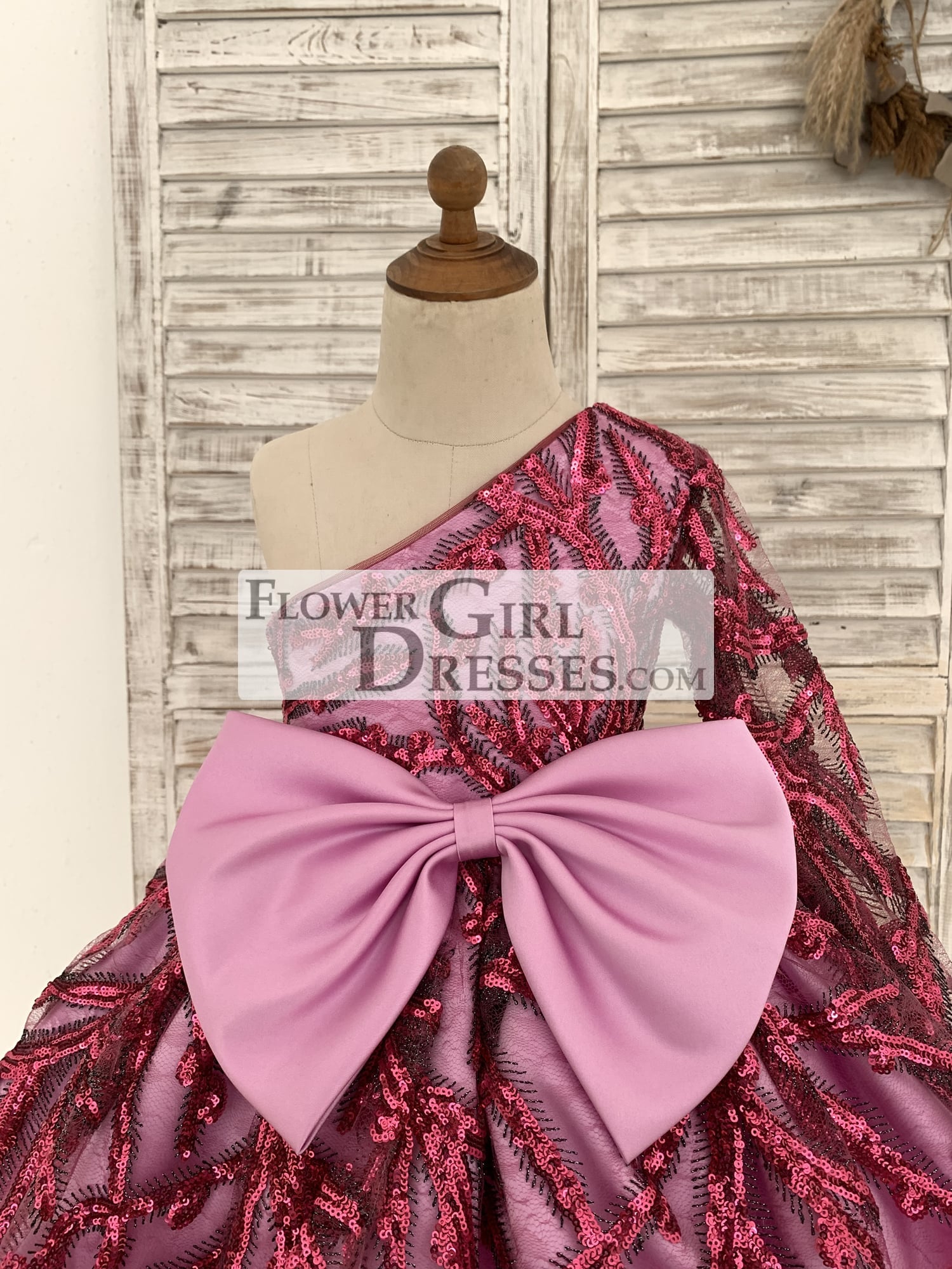 One Shoulder Single Sleeve Fuchsia Sequin Satin Wedding Flower Girl Dress