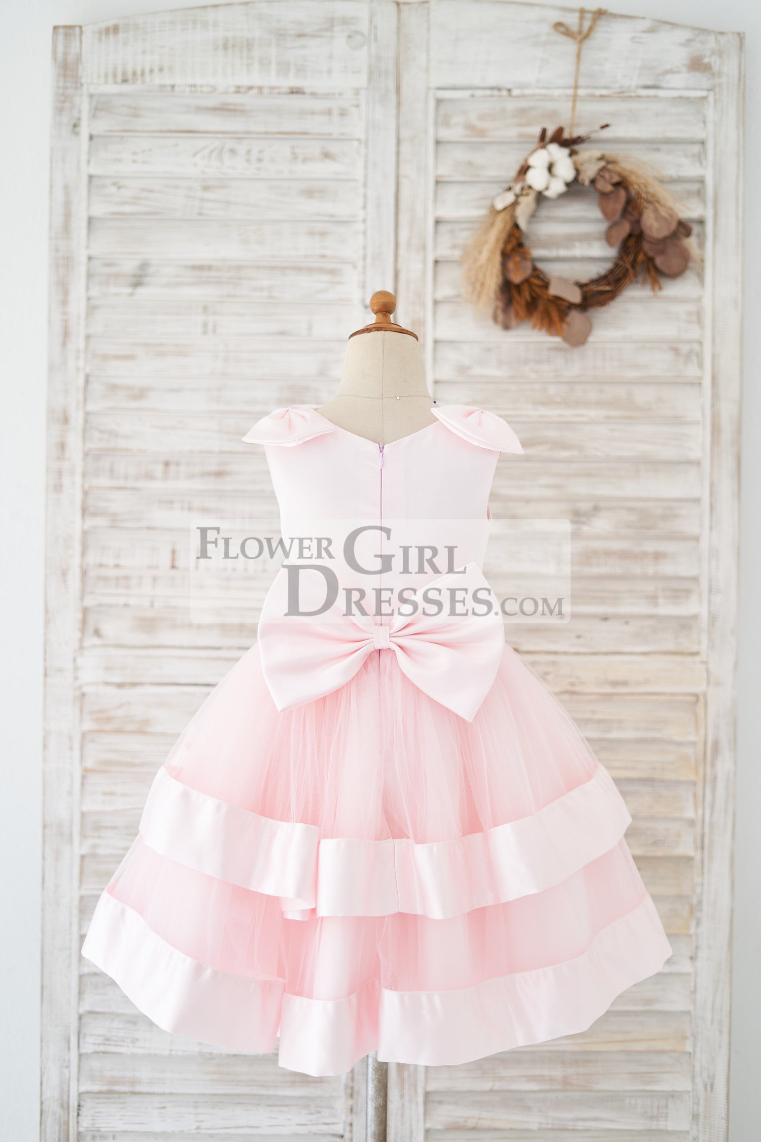 Pink Satin Tulle Cupcake Wedding Flower Girl Dress, Bow