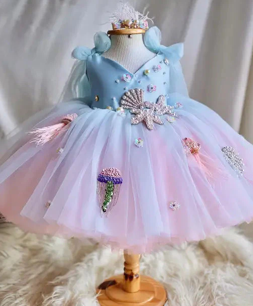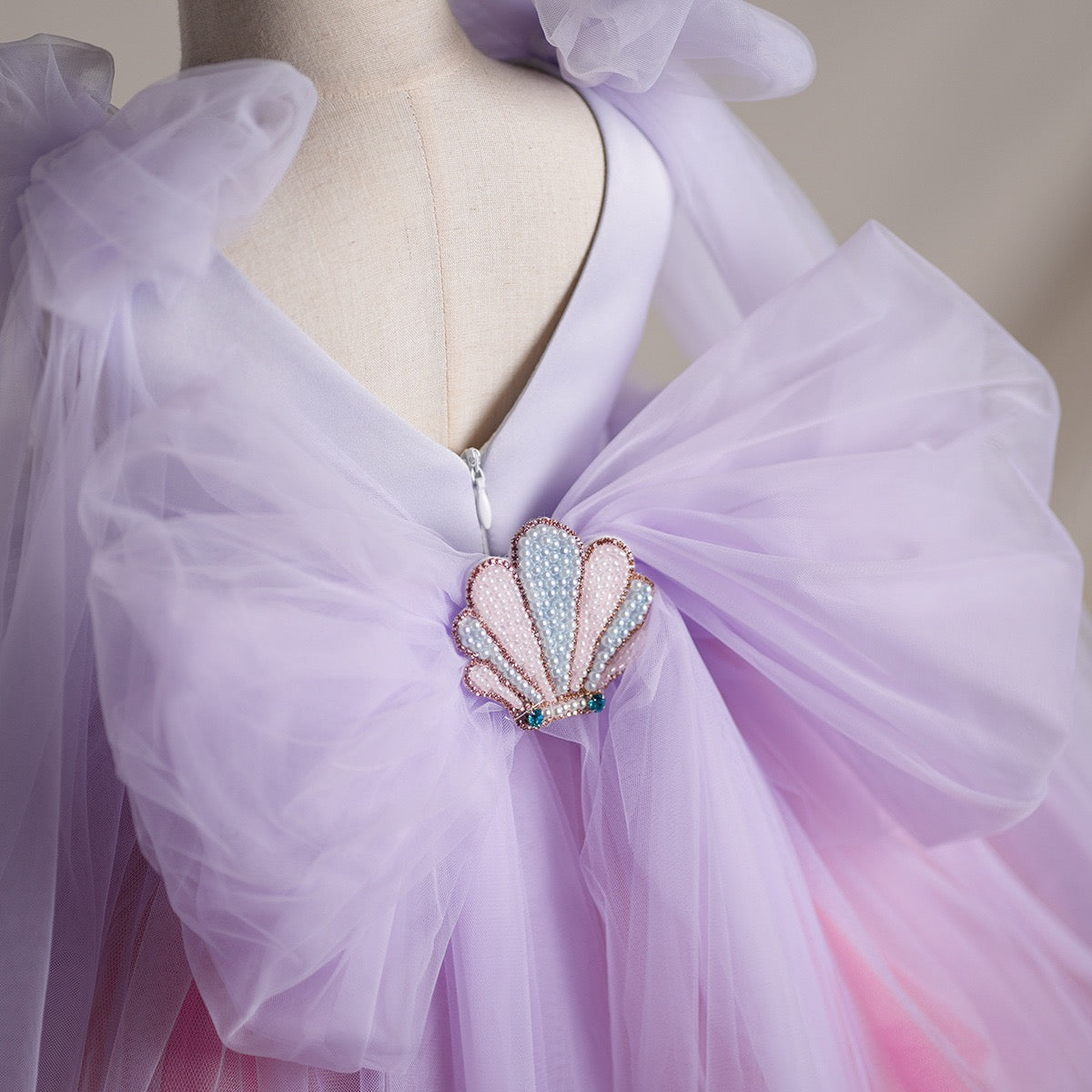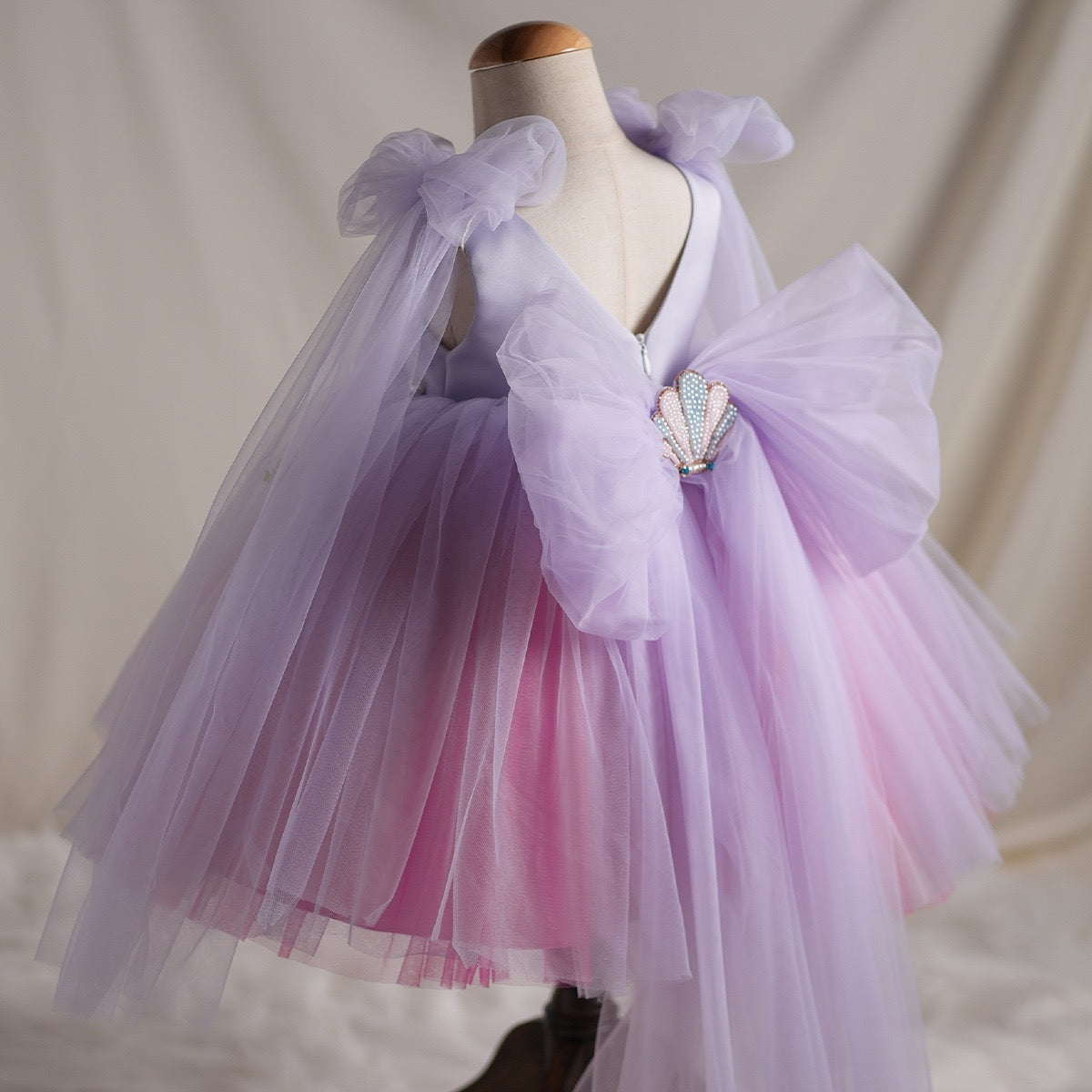 Inspired by the magic of the ocean, this fancy baby dress evokes the ethereal beauty of a seaside sunset in a soft tulle fabric of lavender to blush pink. Front open V neck and back deep V neckline, the bodice is highlighted by handcrafted sea themed embellishments, glistening seashell, beautiful starfish, delicate pearls, and whimsical jellyfishes. Sweet tulle bows grace the shoulders with fairytale drapes, while a dramatic, fluffy bow at the back makes a royal statement. Princess ball gown silhouette, voluminous tulle skirt with soft pleats, this dress is perfect for birthdays, photo shoots, or any big days where magic comes to life.