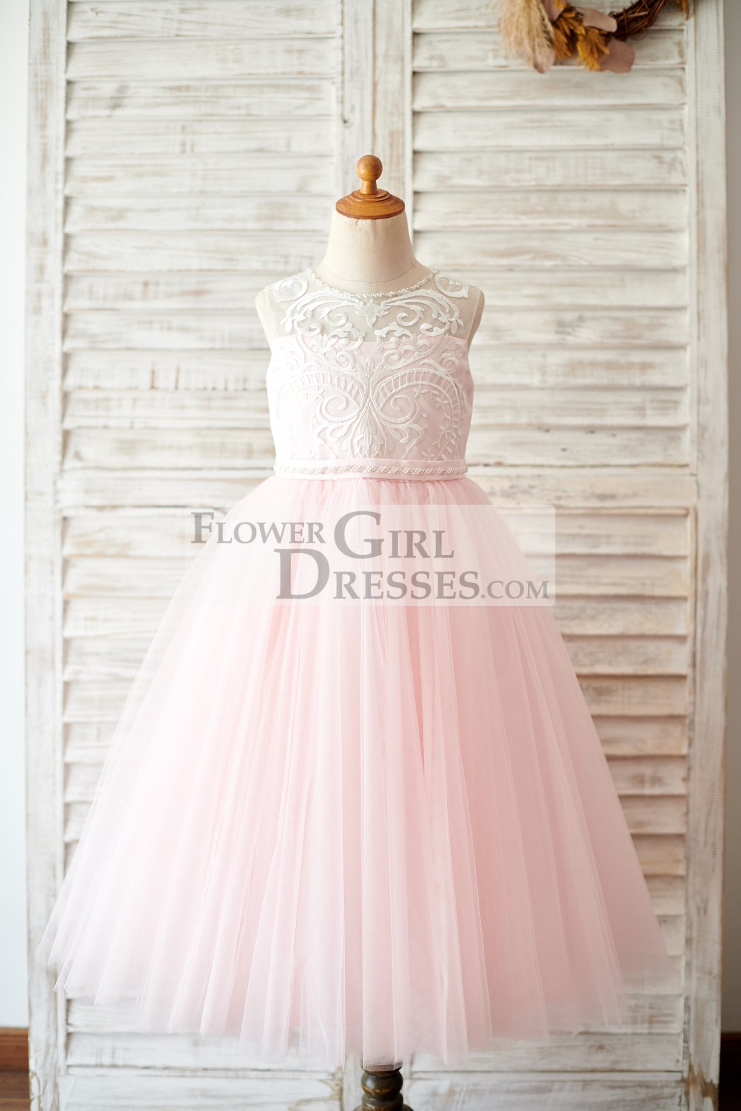 Princess Keyhole Back Ivory Lace Pink Tulle Wedding Flower Girl Dress