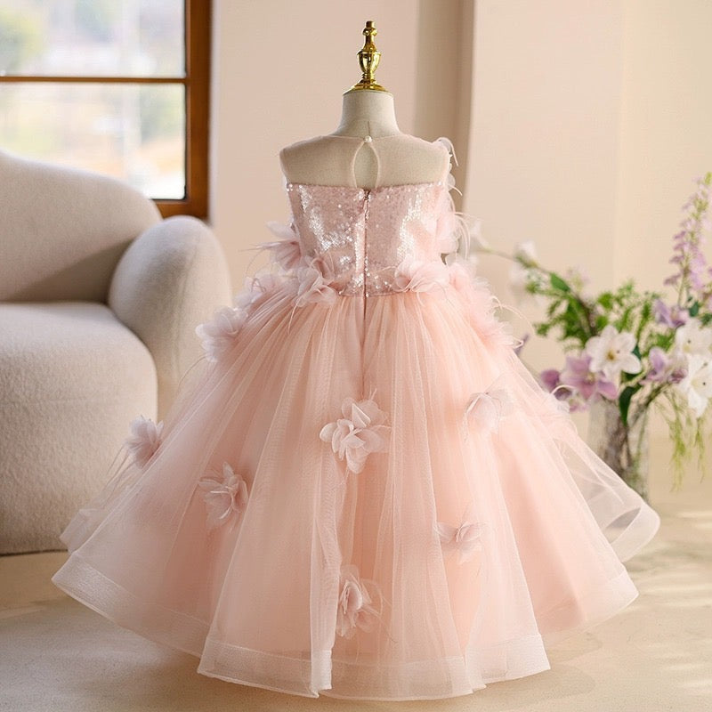 This pink party dress for girls is absolutely a fairytale dream! The bodice is a magical wonder, embellished with sparkling sequins and designed with a V-neckline adorned with sheer fabric at the neck. Delicate 3D floral appliques cover the dress, creating a romantic and sweet vibe—your little princess will look like a walking flower garden in this gown. The back features a sequined design, perfectly complementing the sleeveless bodice, and is finished with a cute keyhole detail. Layer upon layer of airy, soft tulle fabric is adorned with scattered blooms, and the horsehair-trimmed hem completes the look. This long gown has a fairytale-worthy silhouette, perfect for any special occasion.
