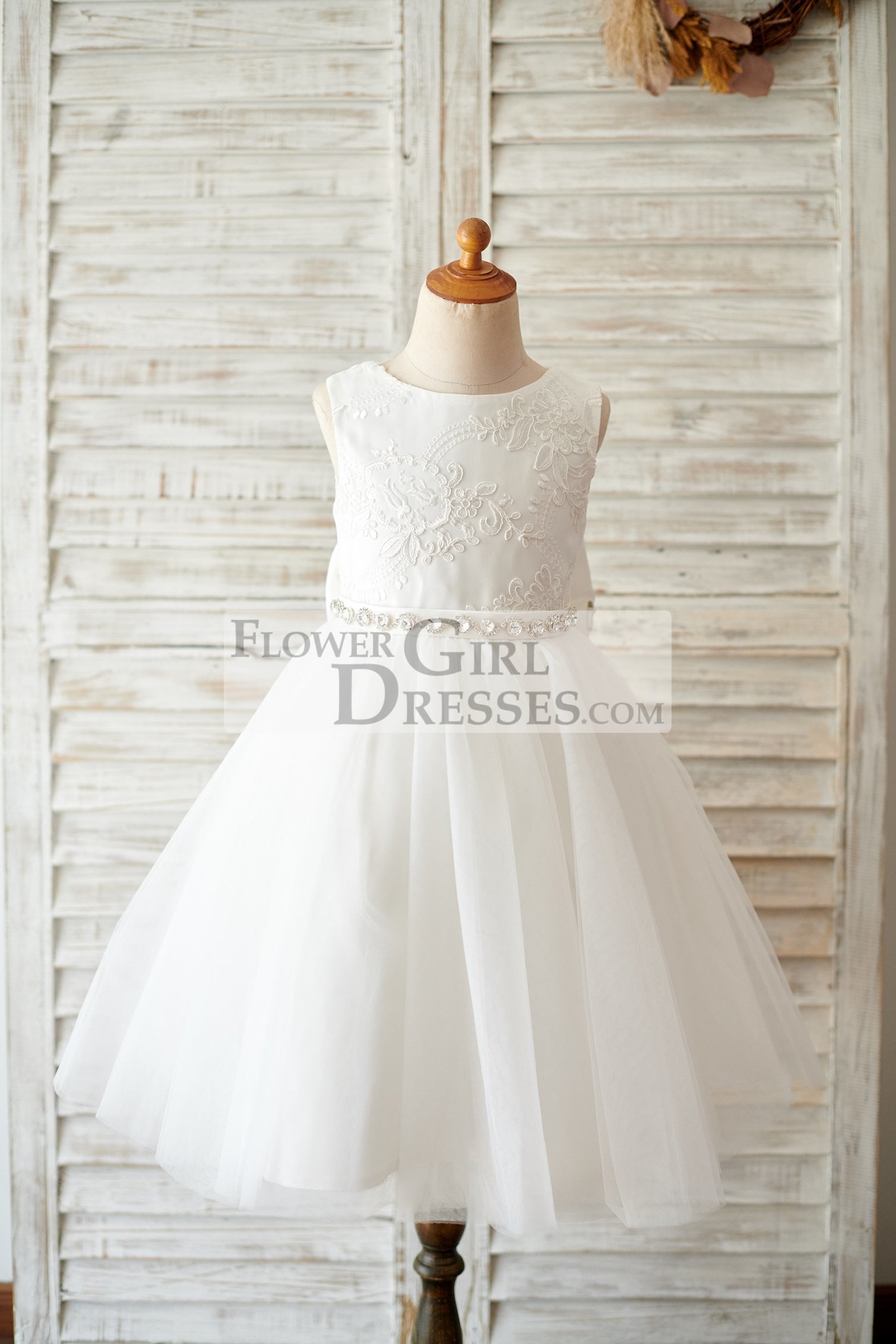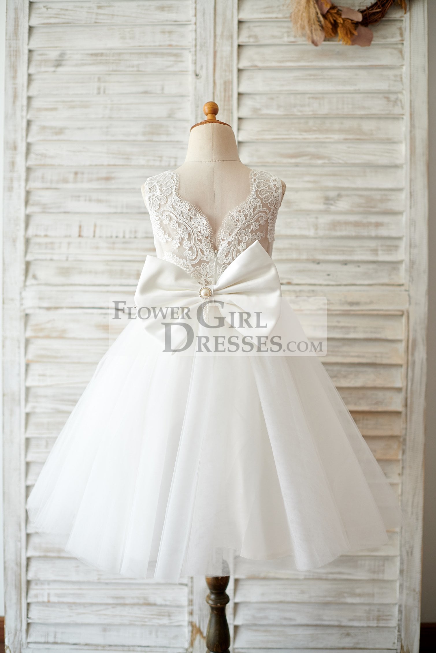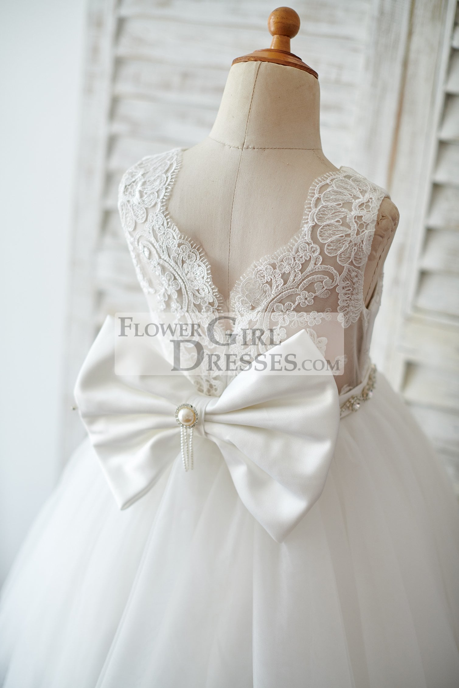 Princess V Back Ivory Lace Tulle Wedding Flower Girl Dress, Big Bow