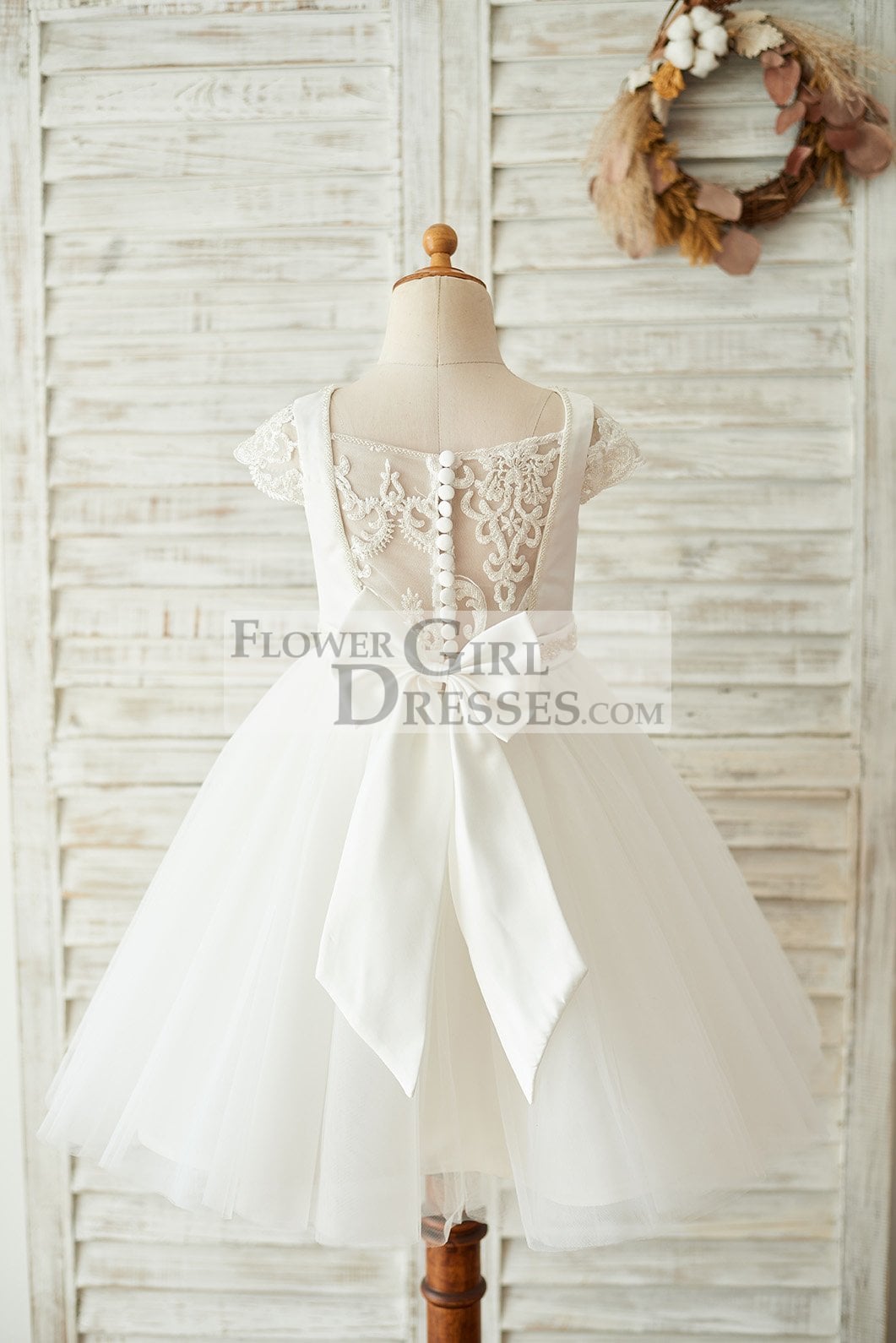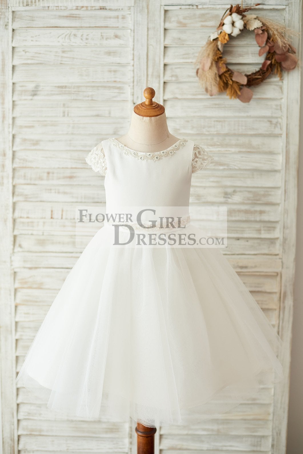 Ivory Satin Tulle Beaded Cap Sleeves Sheer Back Wedding Flower Girl Dress