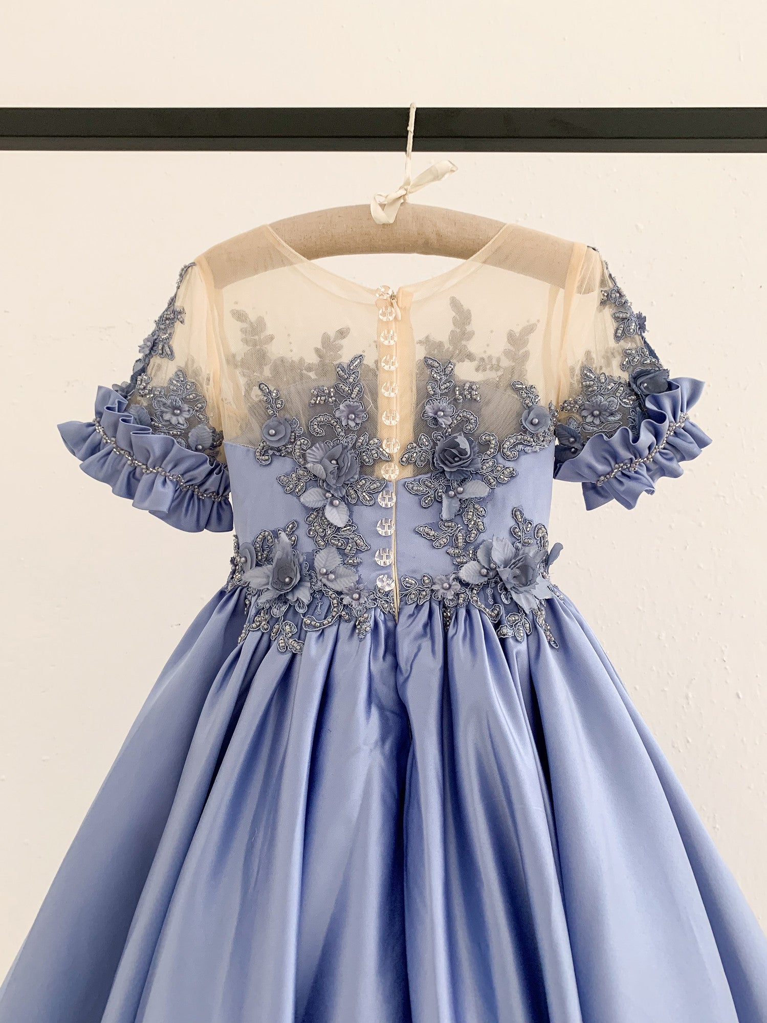- Beaded lace appliques around the waistline;
