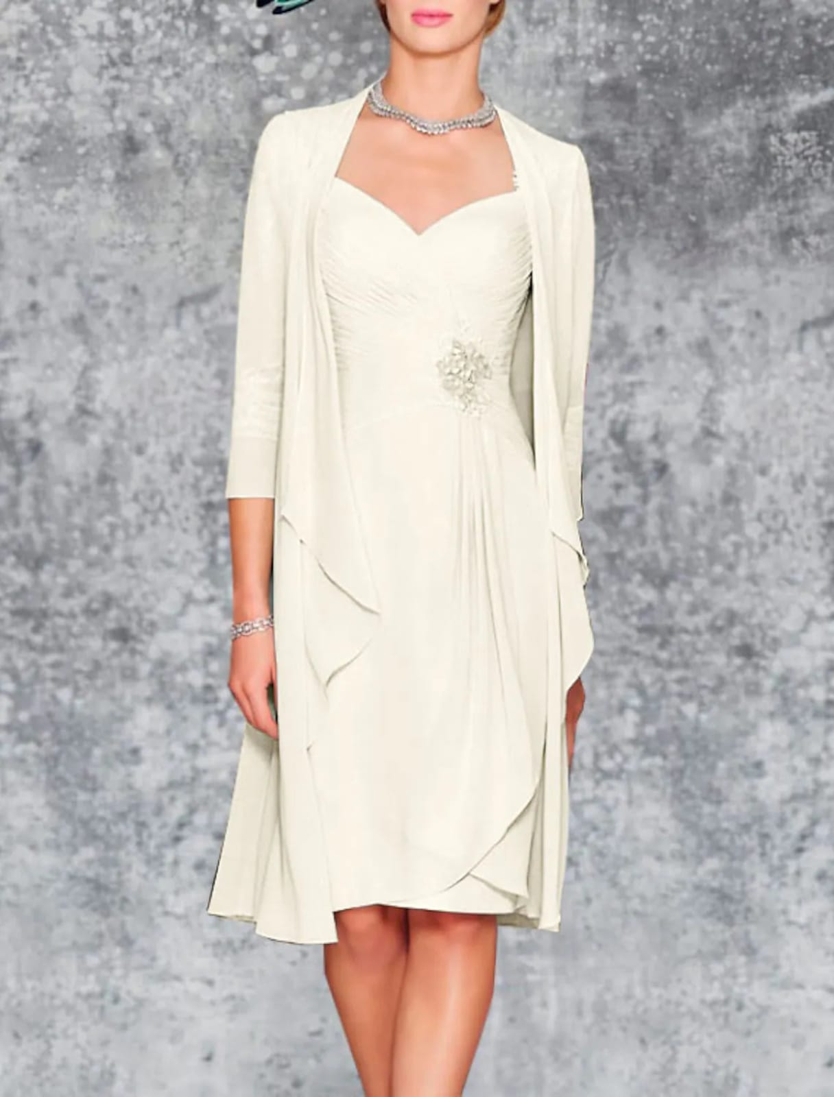 Two Piece Sheath Sweetheart Knee Length Chiffon Mother of Bride Dress, Lace Embroidery
