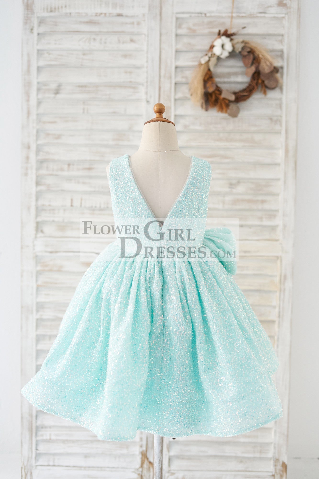Princess V Back Mint Sequin Wedding Flower Girl Dress Kids Party Dress, Bow