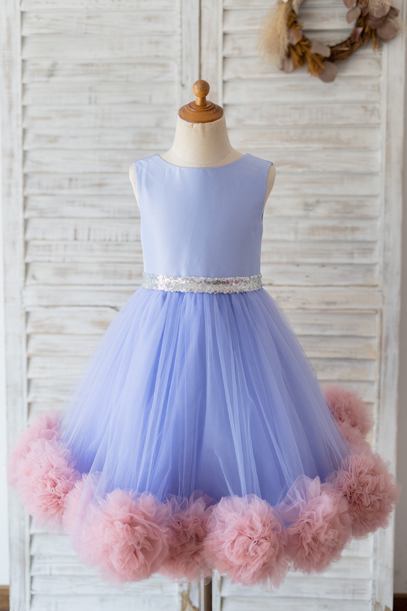 V Back Lavender Satin Tulle Mauve Ruffles Hem Wedding Flower Girl Dress