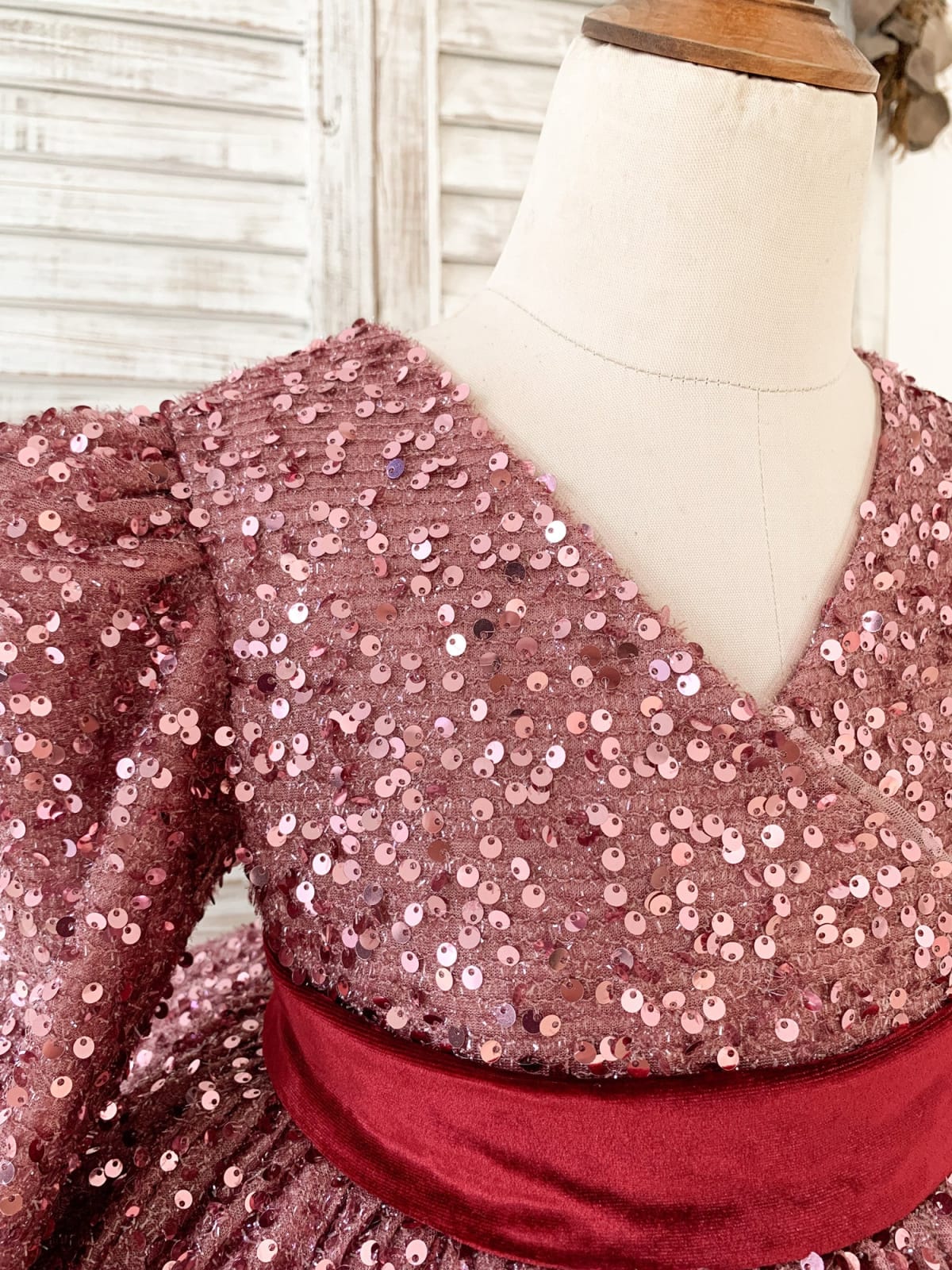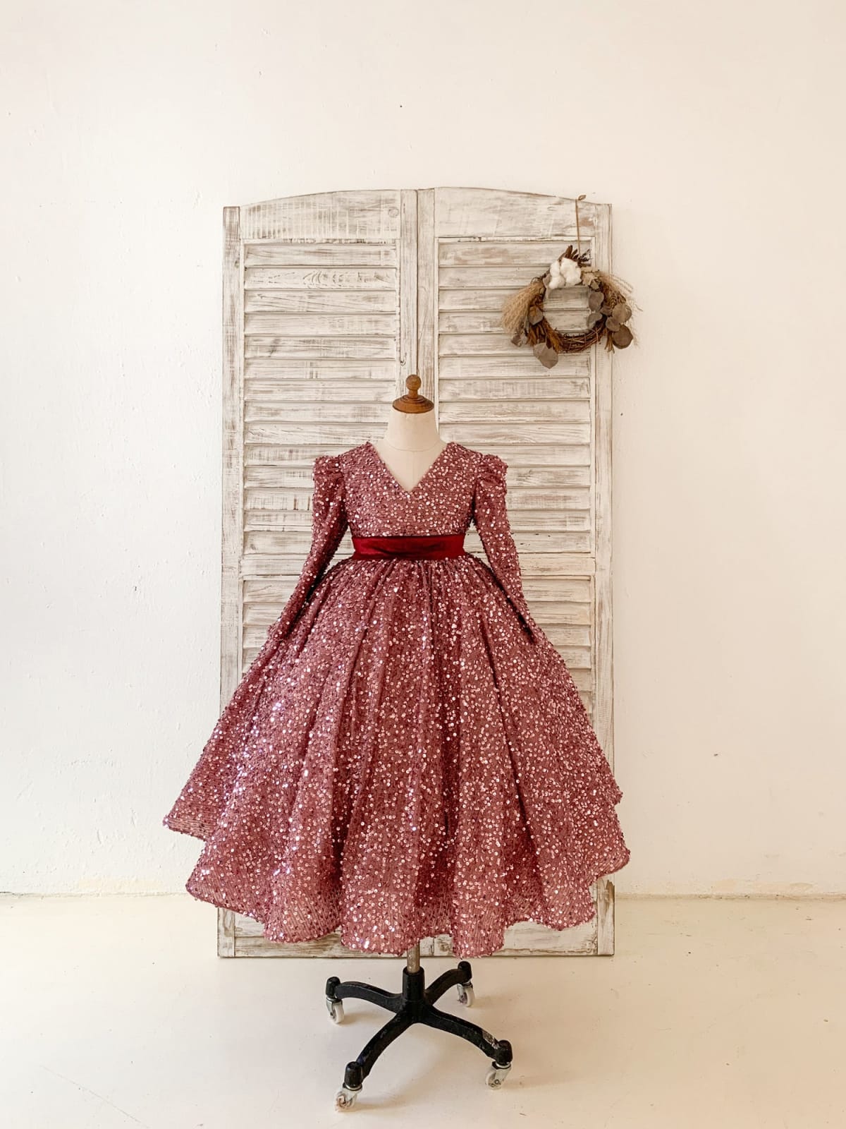 V Back Long Sleeves Burgundy Sequin Wedding Flower Girl Dress Birthday Party Dress