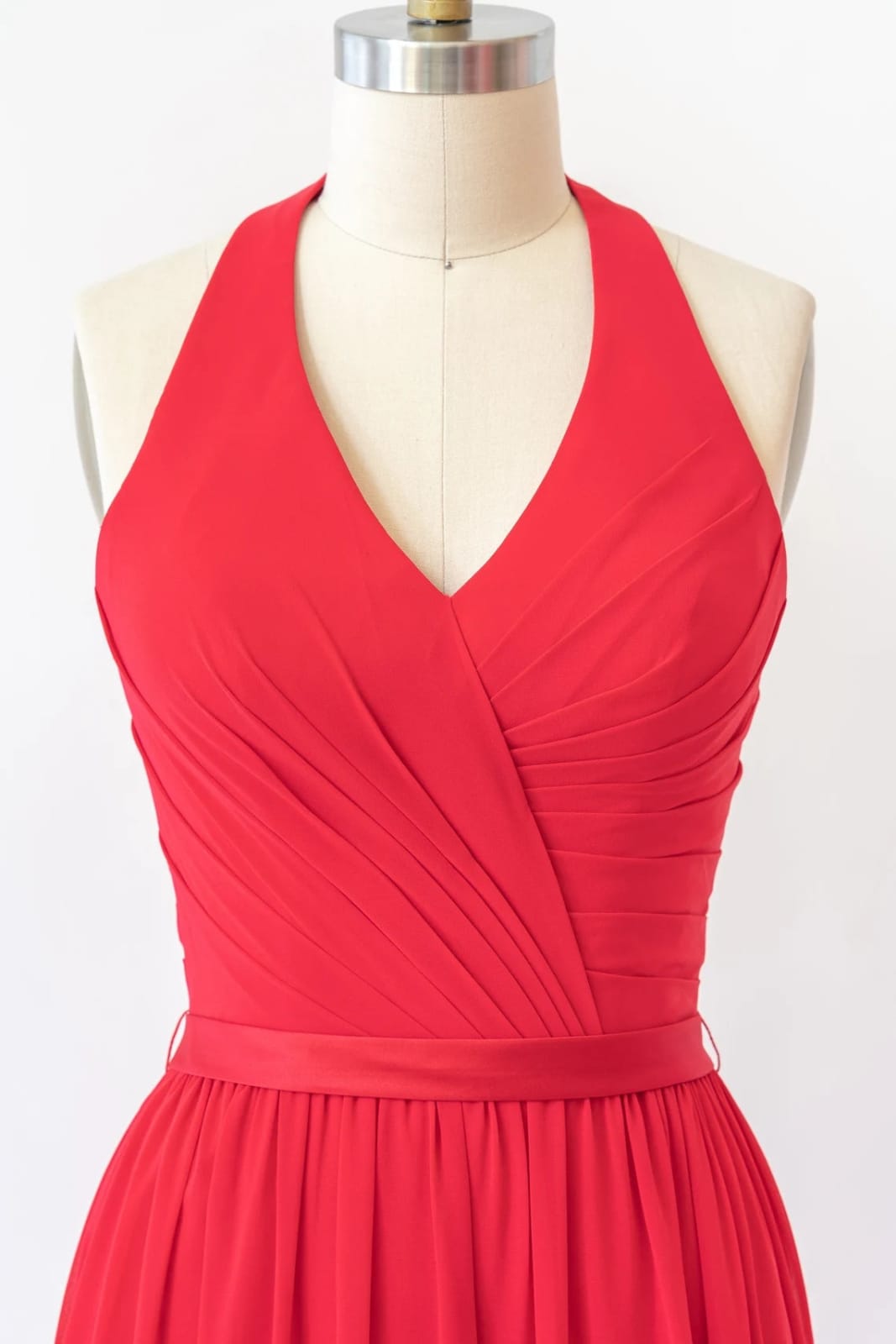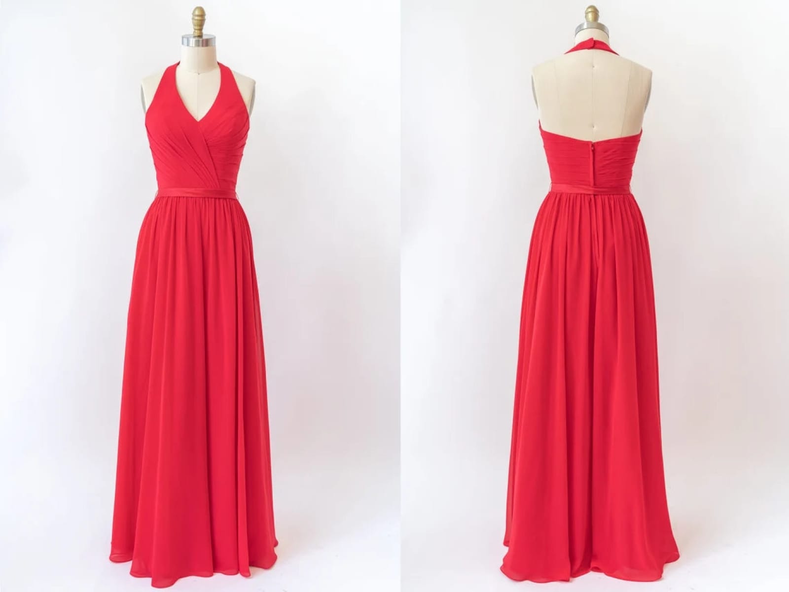 V Neck Halter Sleeveless Backless Red Chiffon Bridesmaid Dress, Belt