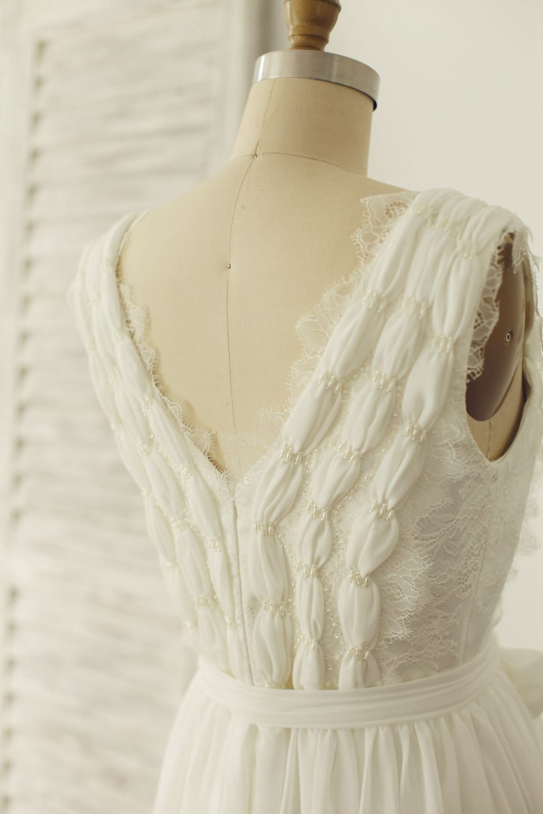 V Neck Ivory Lace Chiffon Wedding Dress Bridal Gown Wedding Dress, Pearls