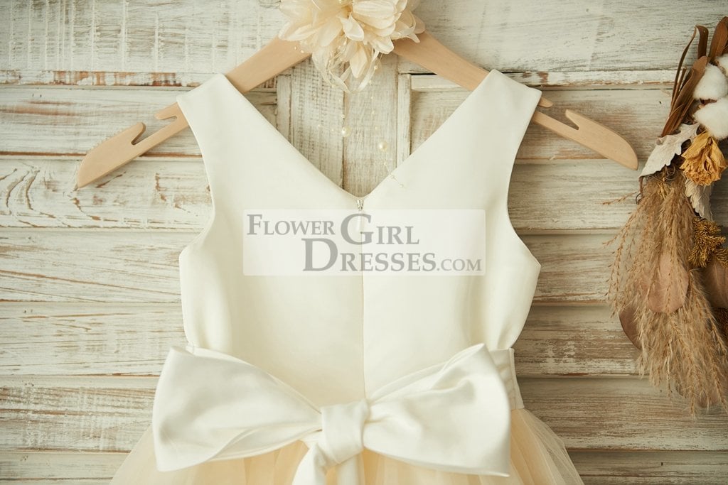 V Neck Ivory Satin Champagne Tulle Wedding Flower Girl Dress, Belt