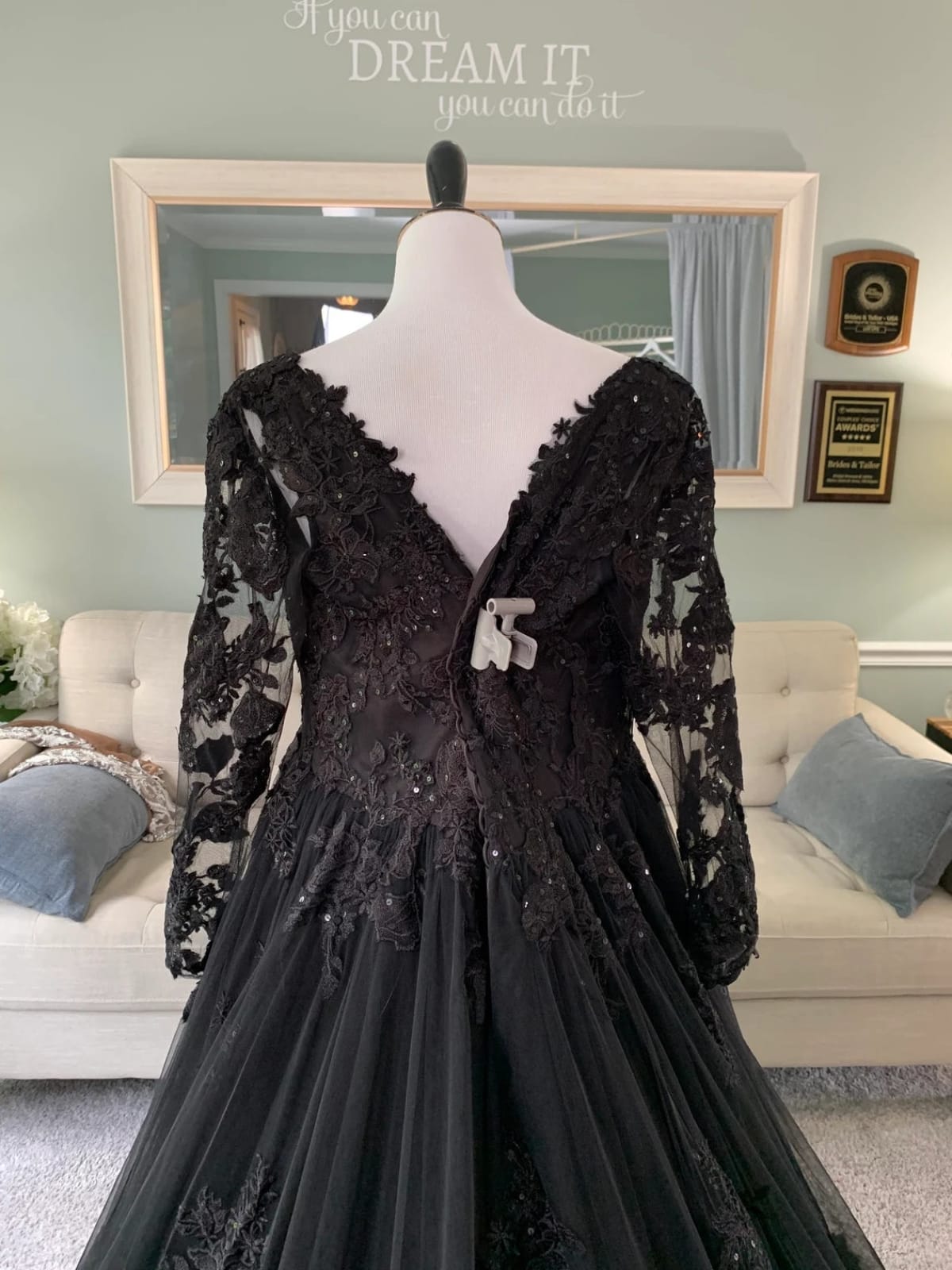 1. Gothic-style wedding gown is adorned with sparkle sequins and embroidered lace;