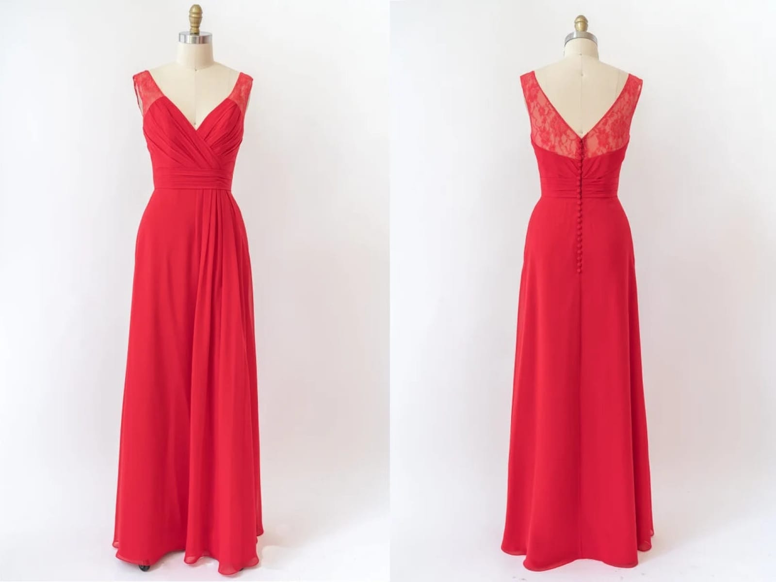 V Neck Sleeveless Long Lace Chiffon Red Bridesmaid Dress, Buttons
