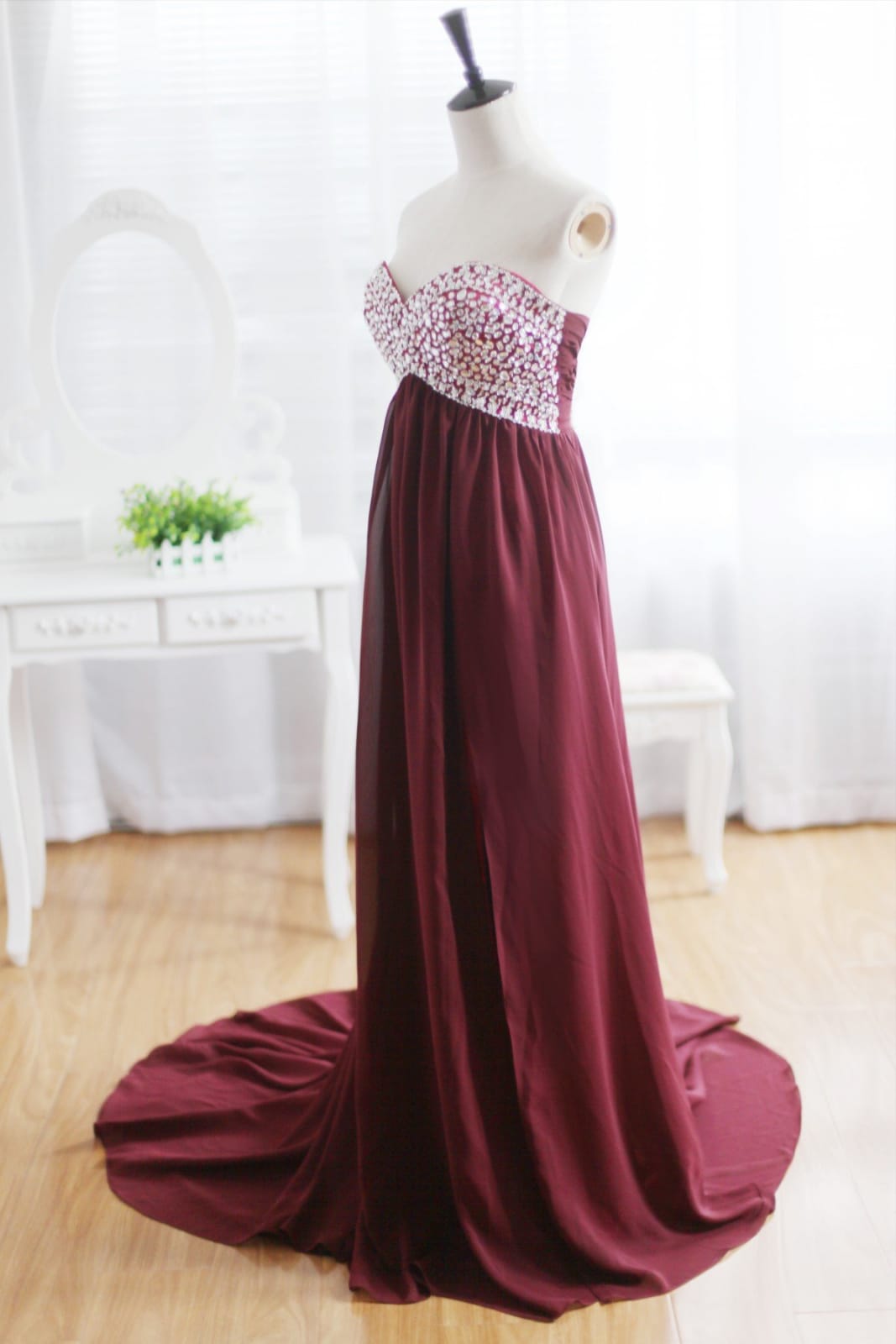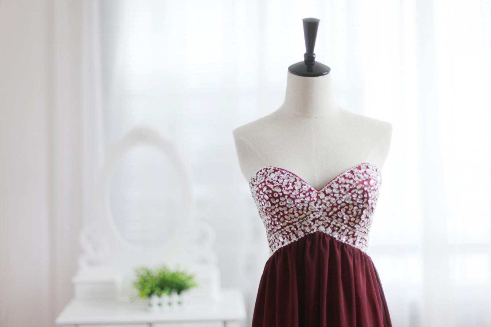 Wine Red Burgundy Chiffon Bridesmaid Dress Prom Dress Strapless Beaded Dress